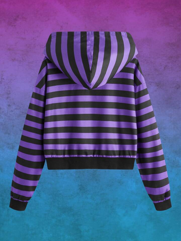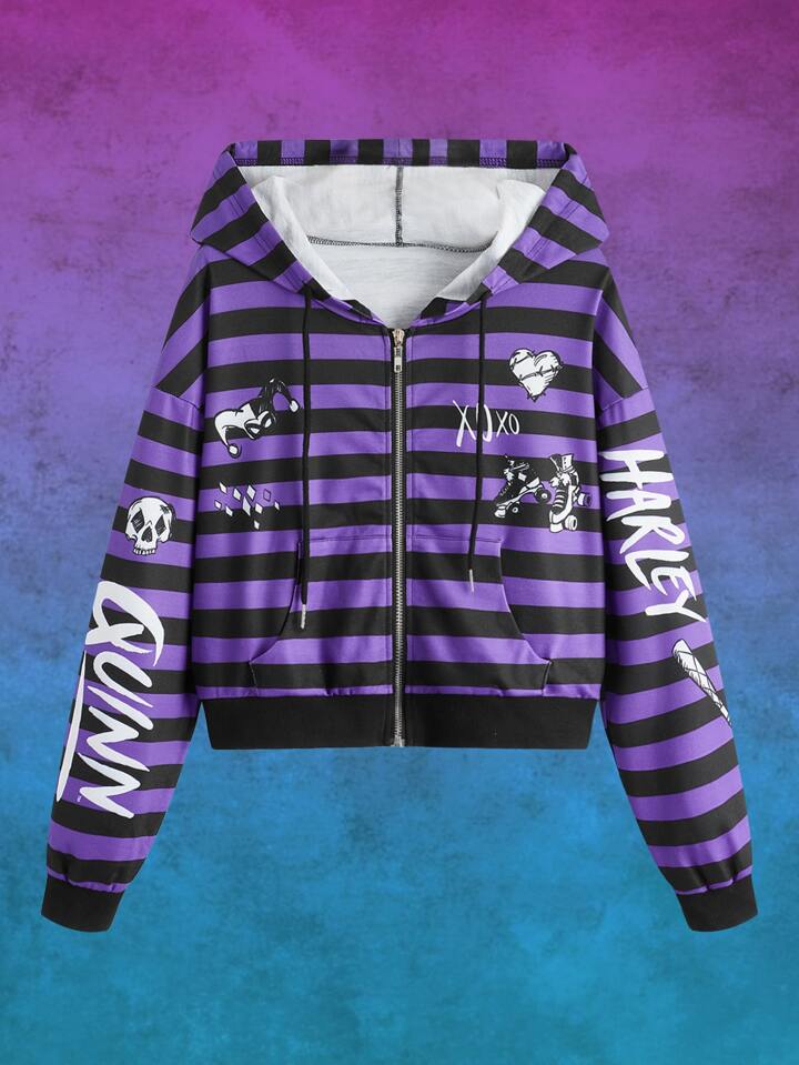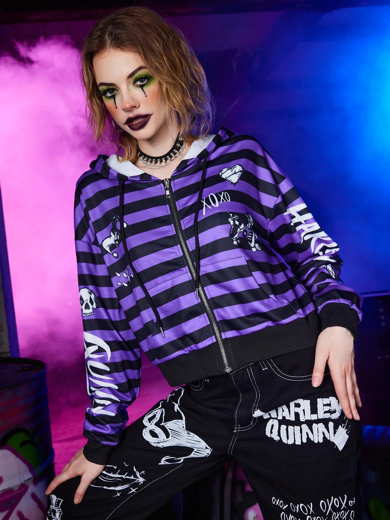 Harley Quinn | ROMWE Sweat-shirt à capuche à imprimé tête de mort et lettre à rayures zippé à cordon