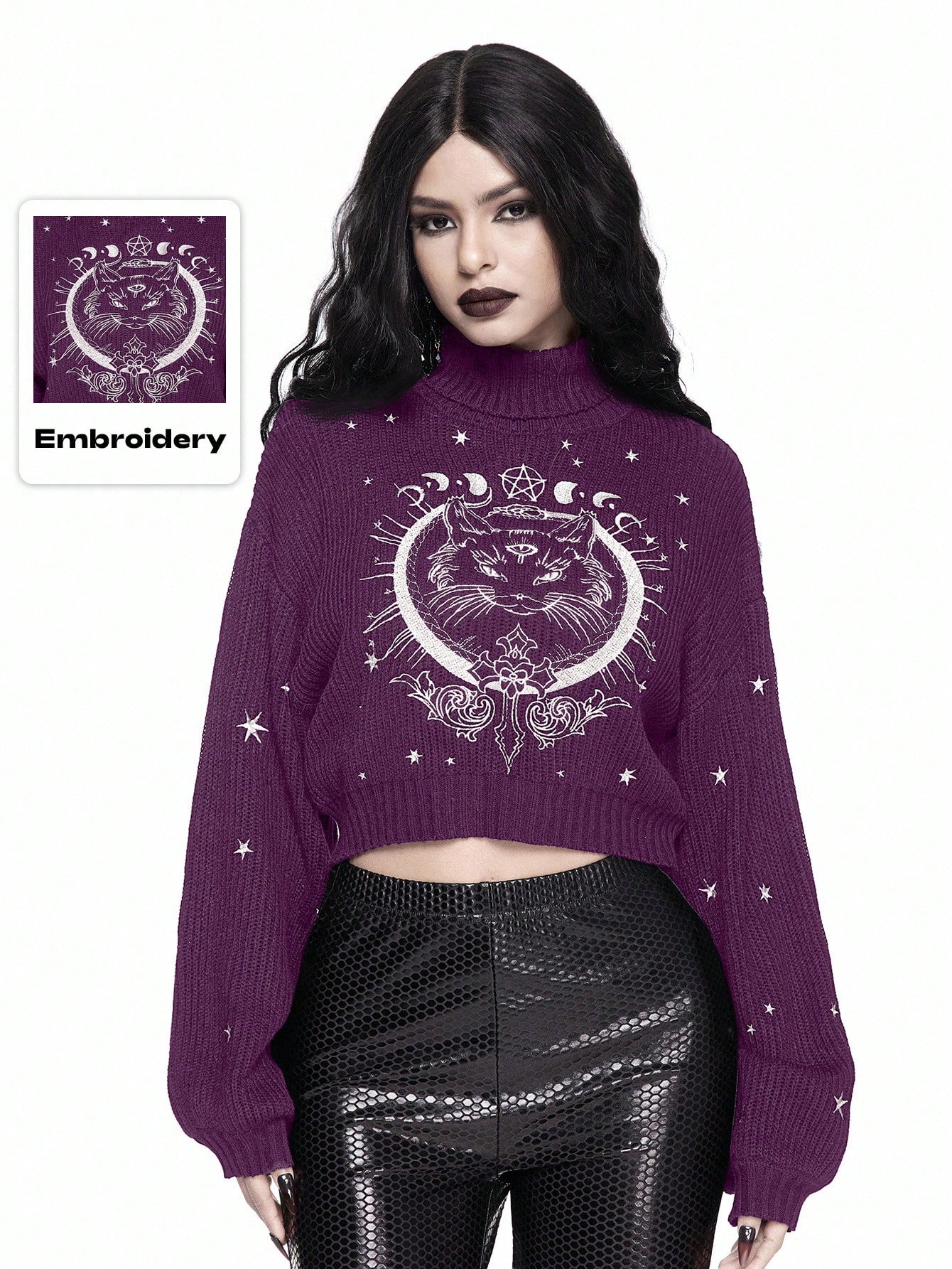 Pull sombre à col montant, broderie mystérieuse de chat gothique noir
