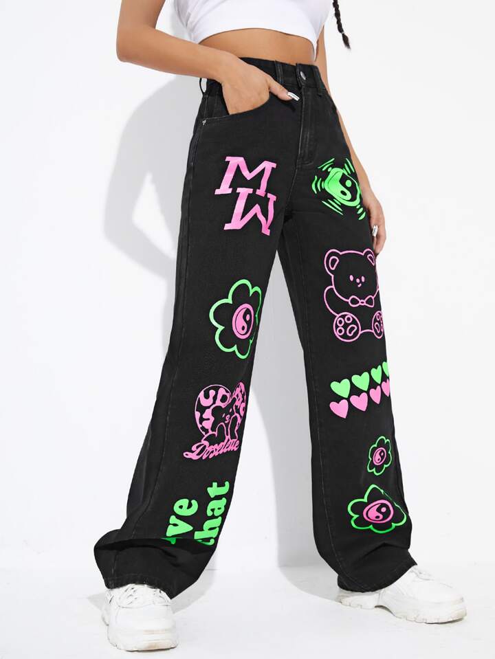 Jean boyfriend taille haute à lettre à dessin animé
