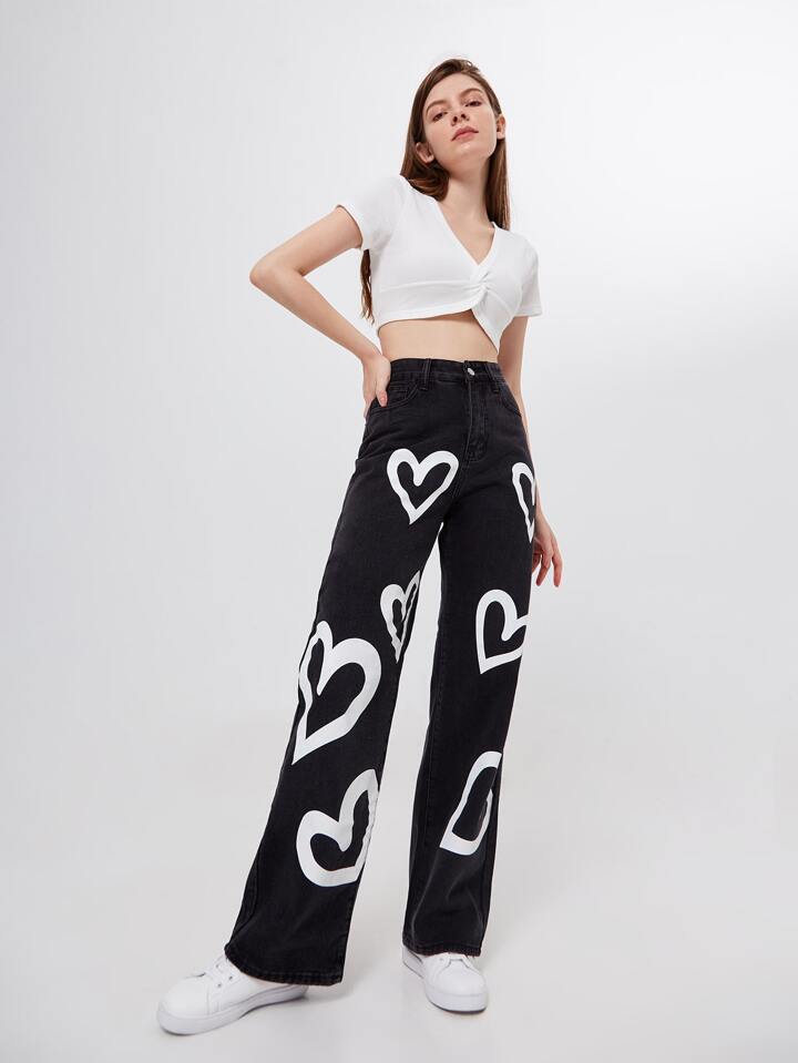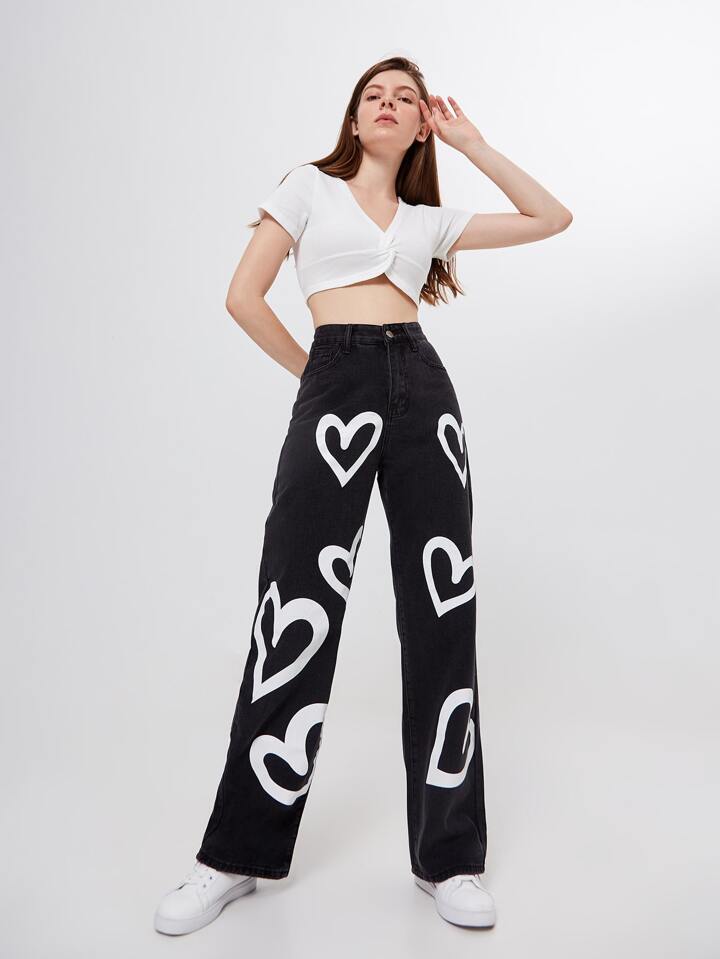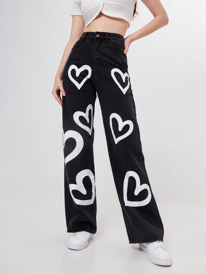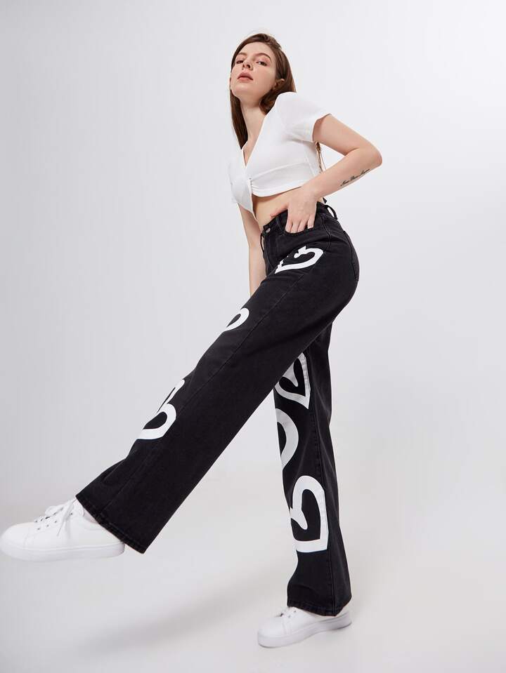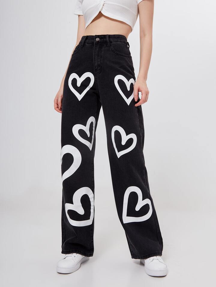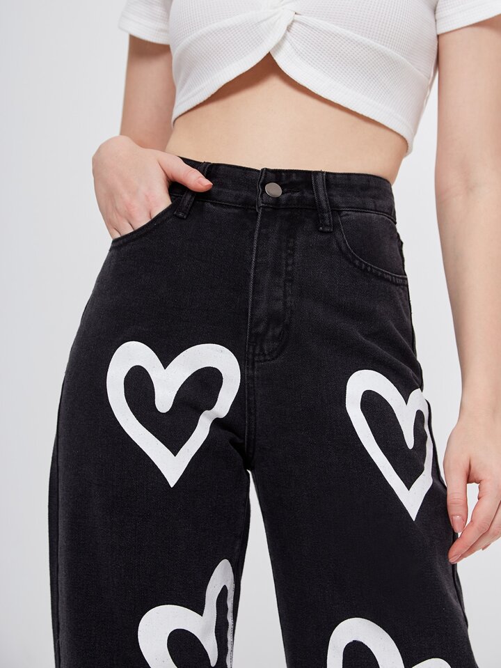 Jean boyfriend taille haute avec imprimé cœur