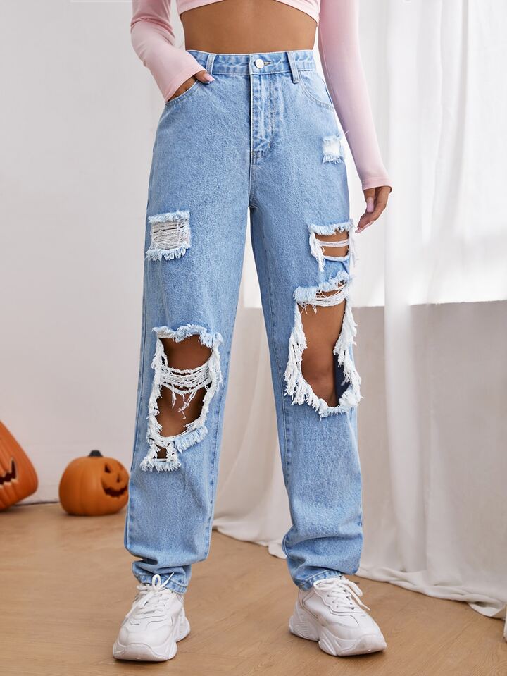 Jean taille haute déchiré découpe ourlet effiloché