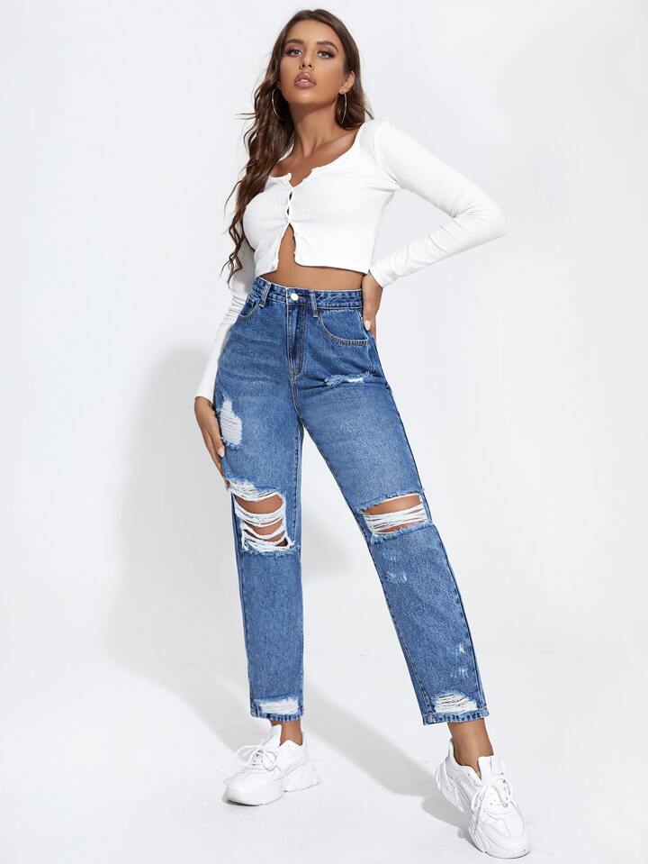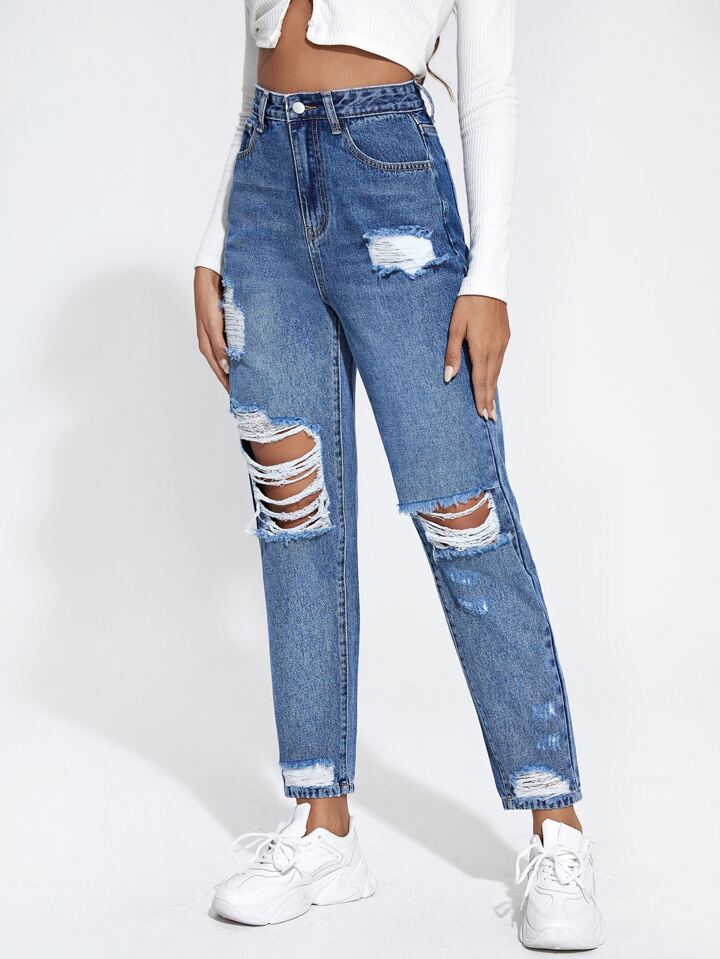 Jean mom déchiré taille haute