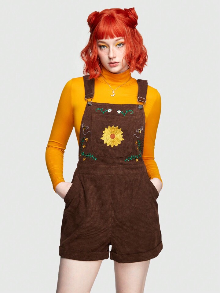 Hippie Salopette En Velours Côtelé À Motif Artistique Brodé De Tournesol