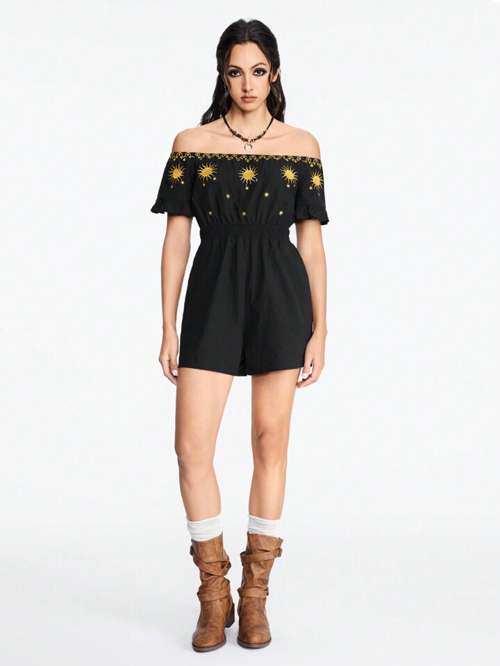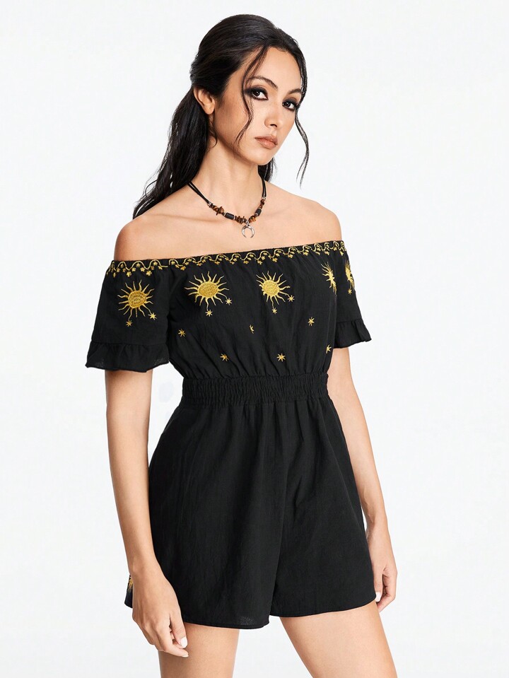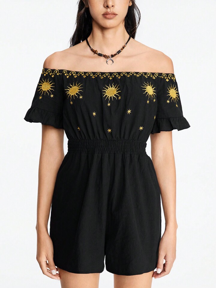 Hippie Combi-short à épaules dénudées avec design de lune et d'étoile brodé pour femmes, style décontracté pour vacances