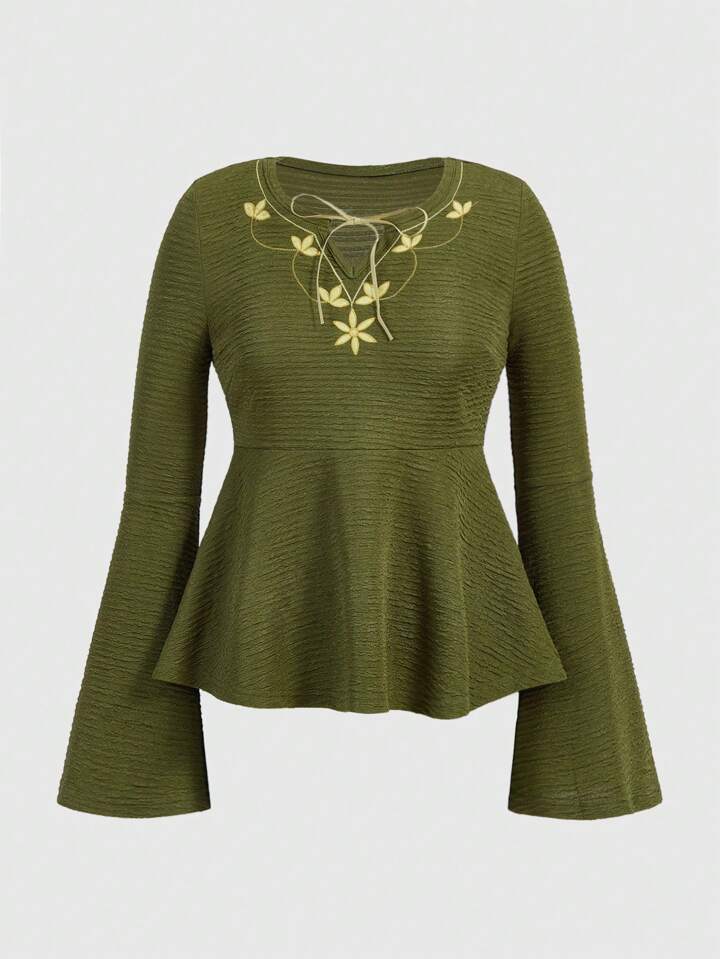 Hippie Top Péplum Brodé Fleur À Nœud À Manche Évasée