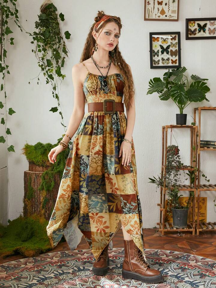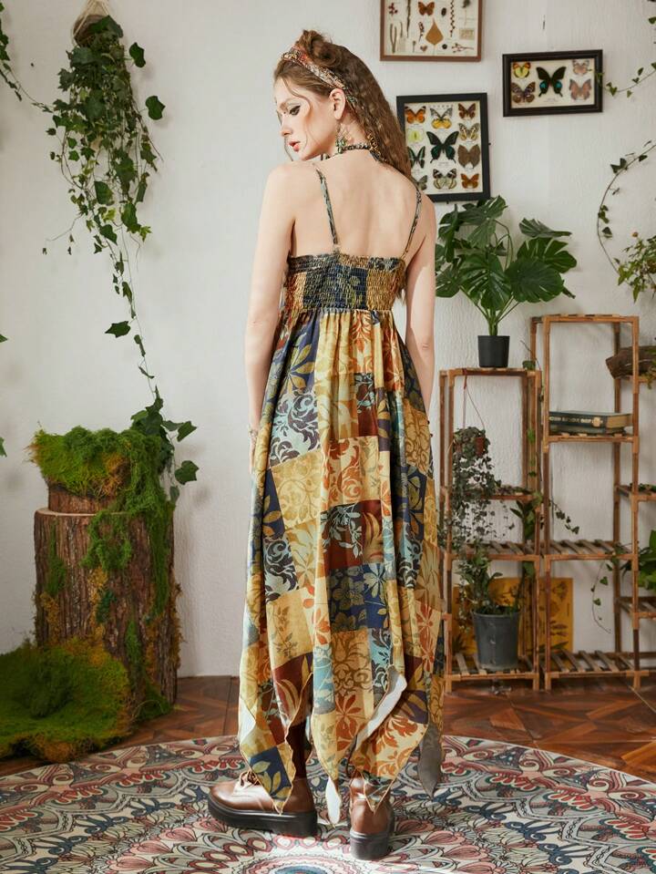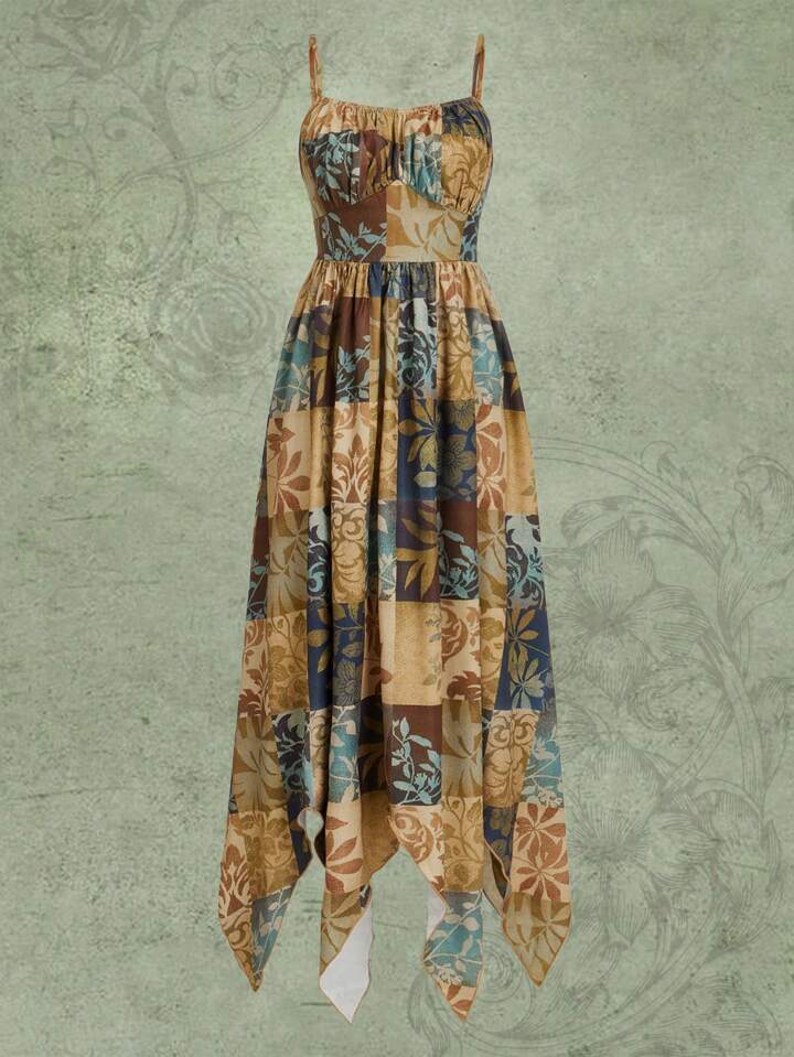 Hippie Robe À Fines Brides Imprimé Patchwork Froncé Ourlet Hanky
