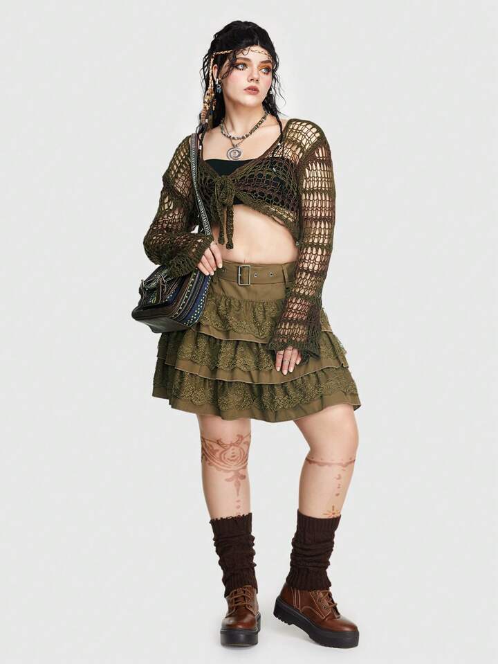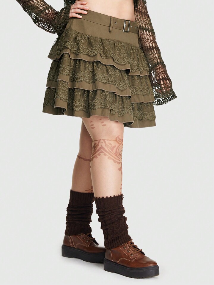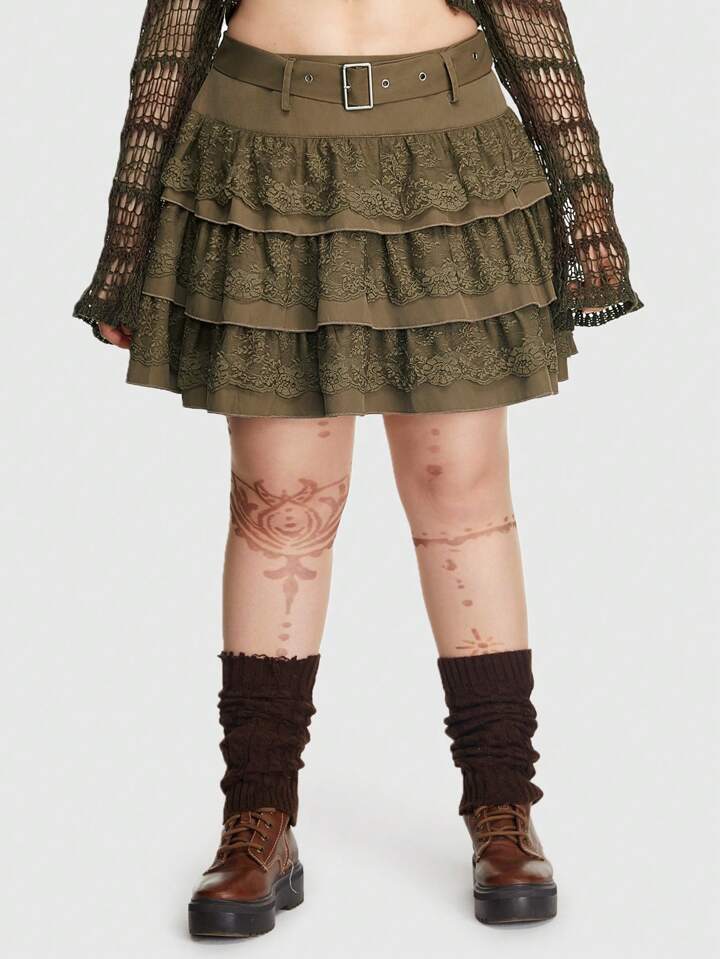Hippie Plus Jupe En Dentelle Ourlet Superposé Avec Ceinture