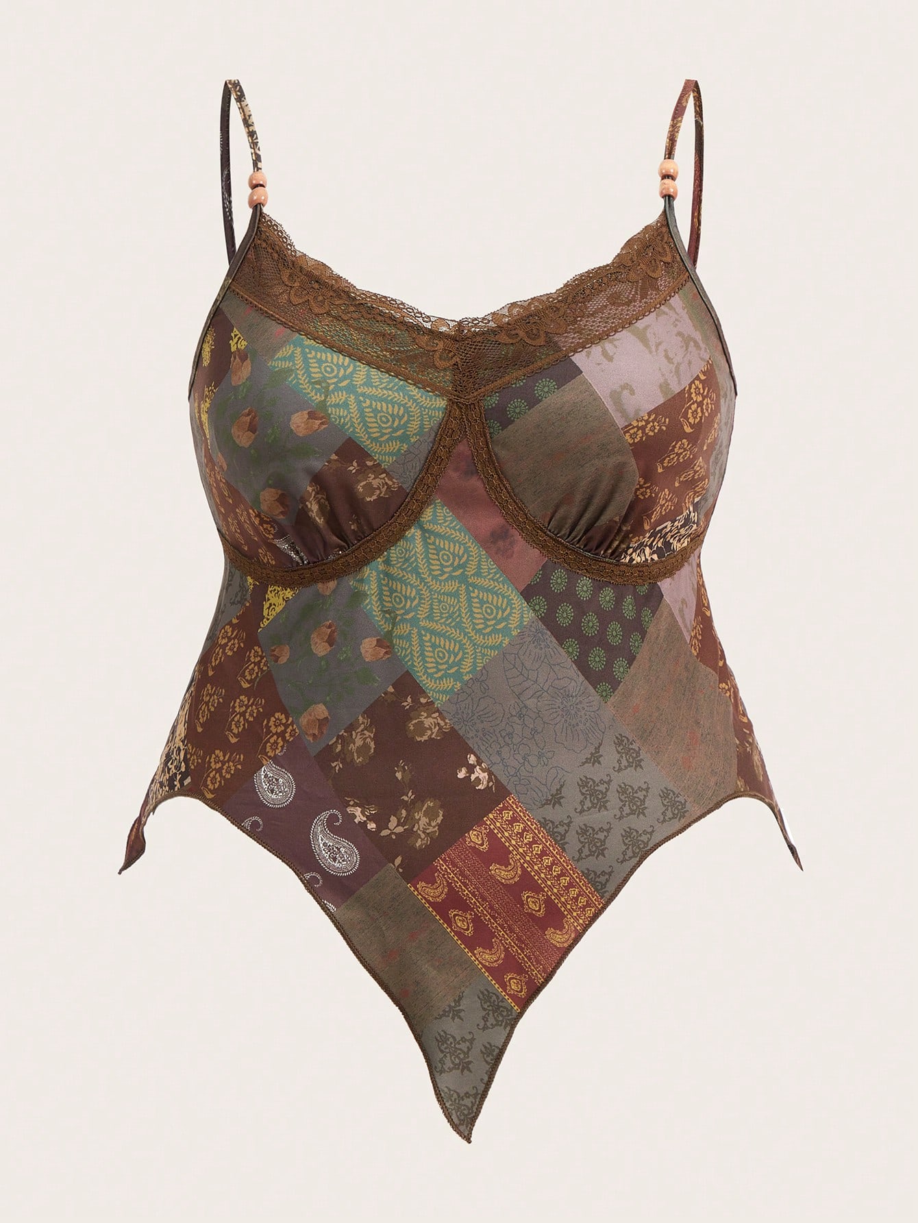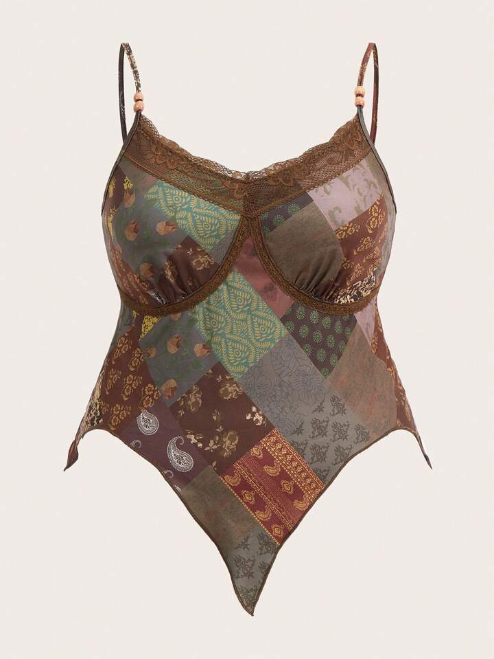 Hippie Plus Top À Fines Brides Imprimé Patchwork Ourlet En Dentelle Ourlet Hanky