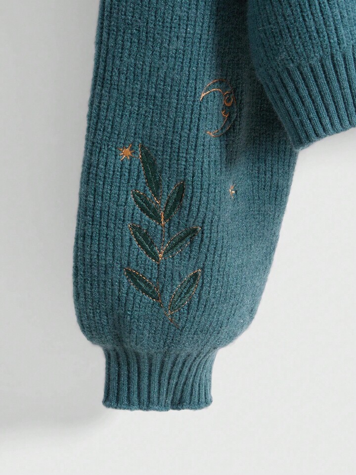 Hippie pull style rétro bohème de vacances avec broderie de lune et d'étoiles bleu-vert