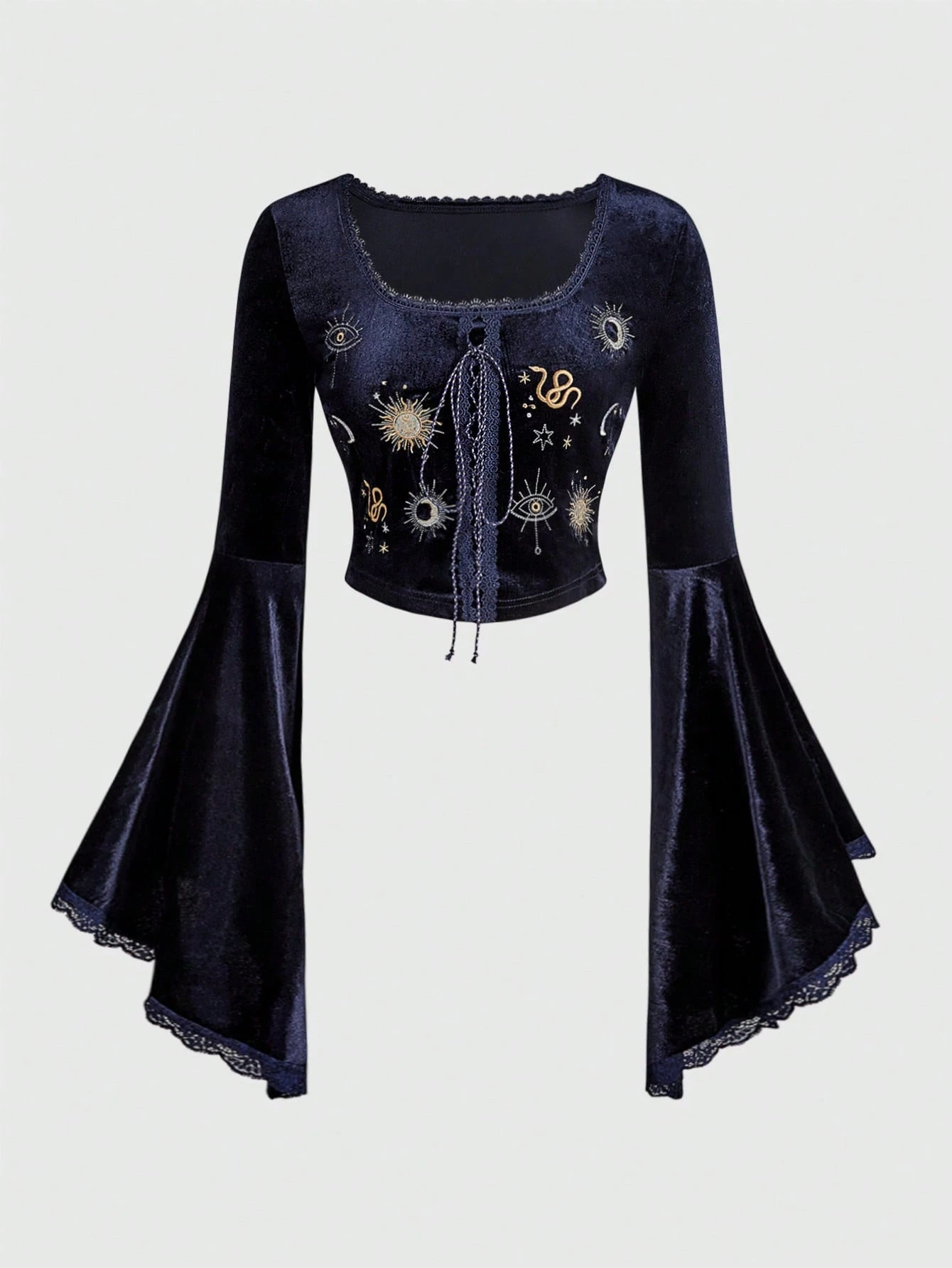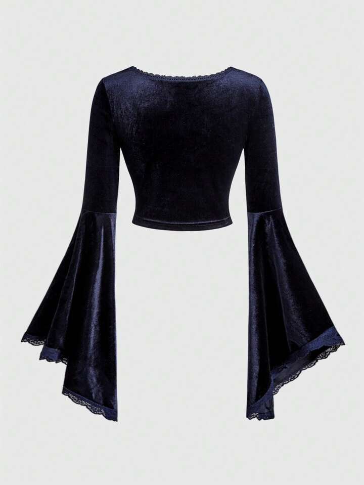 Hippie T-shirt ajusté pour femmes à manches évasées, en velours brodé, style polyvalent, romantique et sorcière pour Halloween