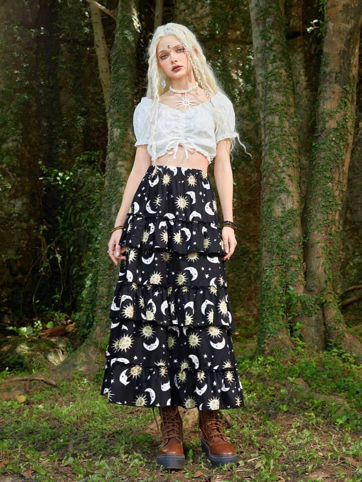 Hippie Jupe Imprimé Soleil Et Lune À Volants