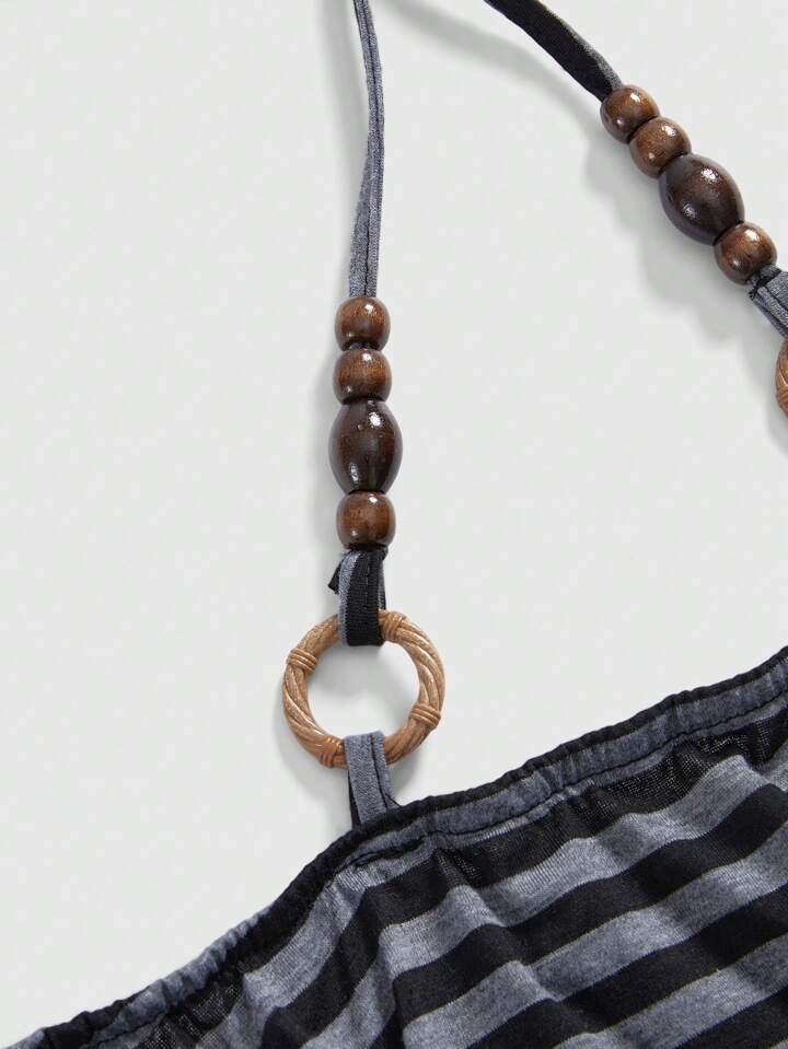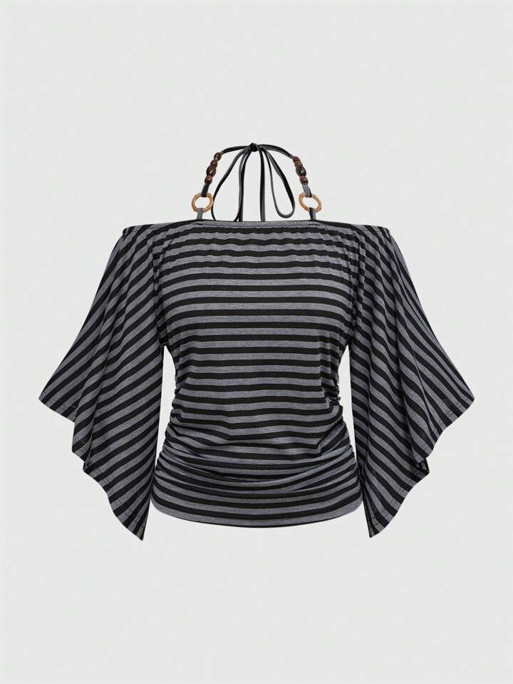Hippie T-shirt femme à manches chauve-souris, à épaules dégagées, à rayures, avec décor de perles en bois vintage et ample
