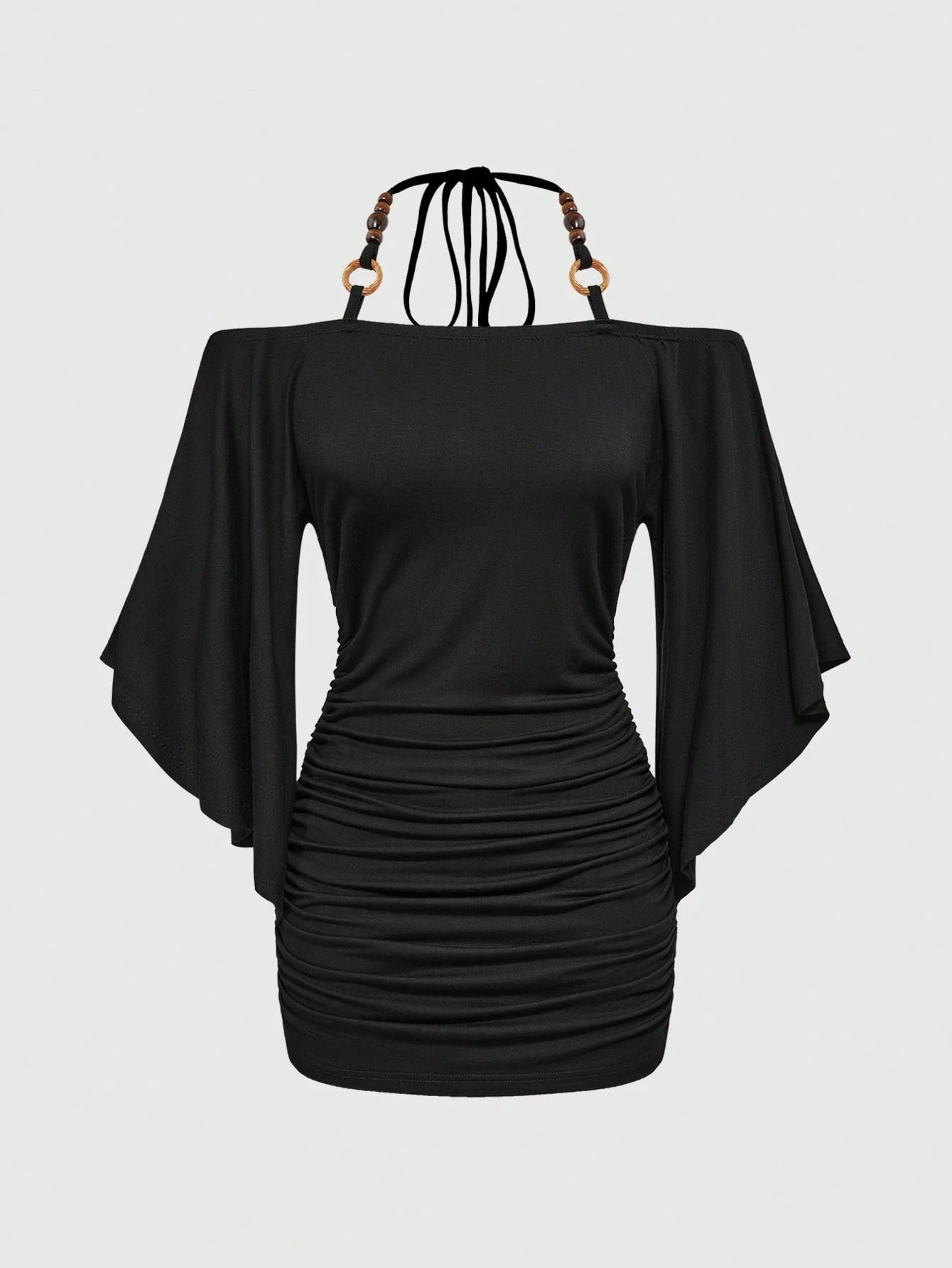 Hippie Robe mini à manches chauve-souris avec décoration de grosses perles de bois vintage pour femmes