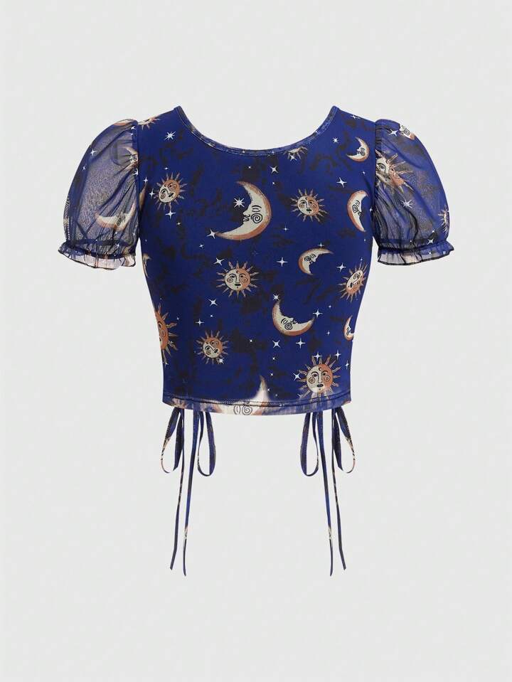 Hippie Haut Pour Femmes Imprimé Du Soleil, De La Lune Et Du Visage Avec Ourlet À Cordon De Serrage