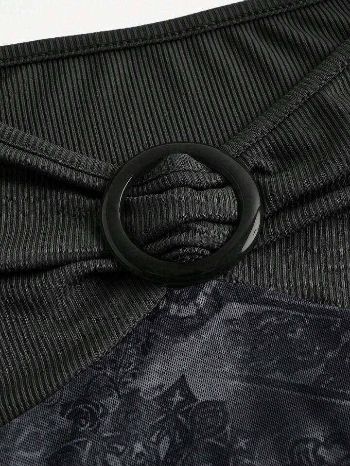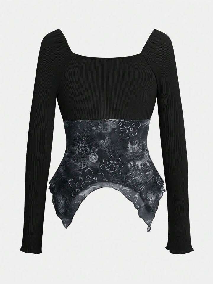 Hippie T-shirt à manches longues avec ourlet asymétrique imprimé floral pour femme
