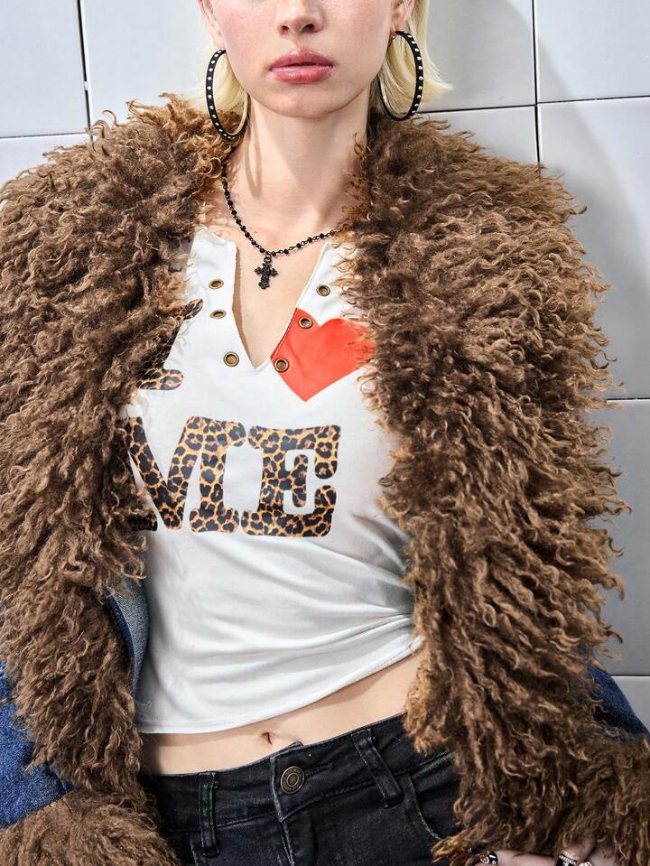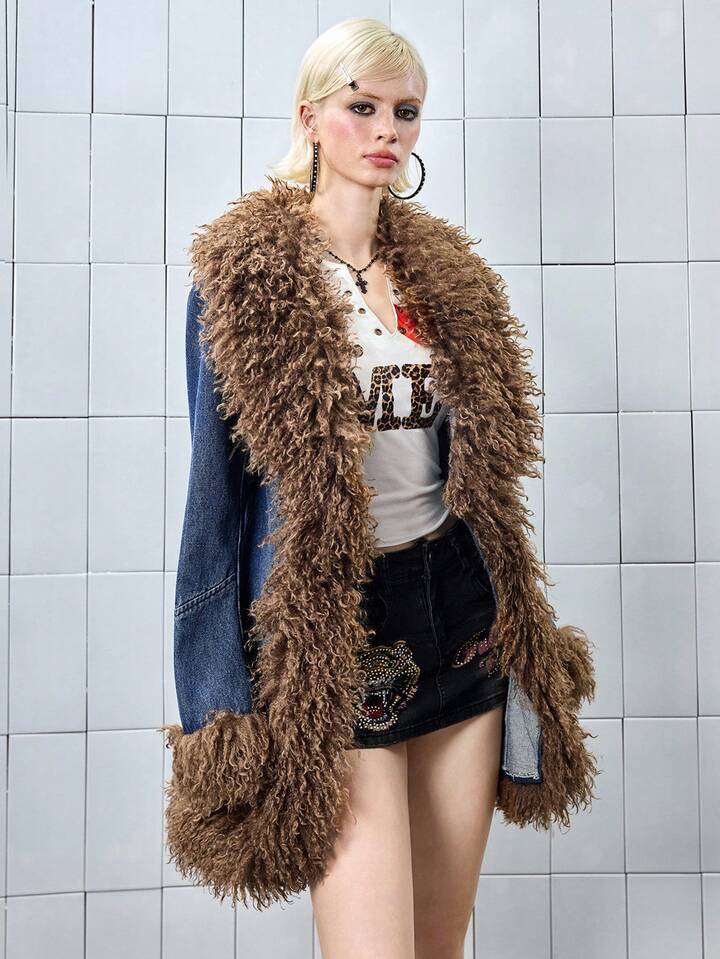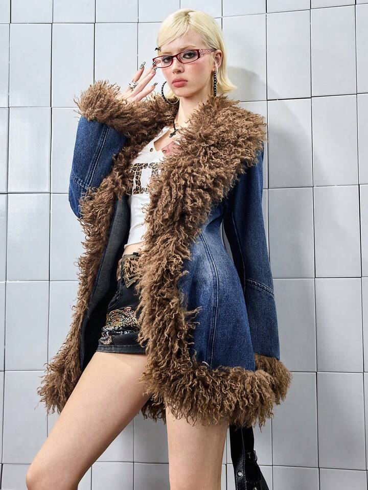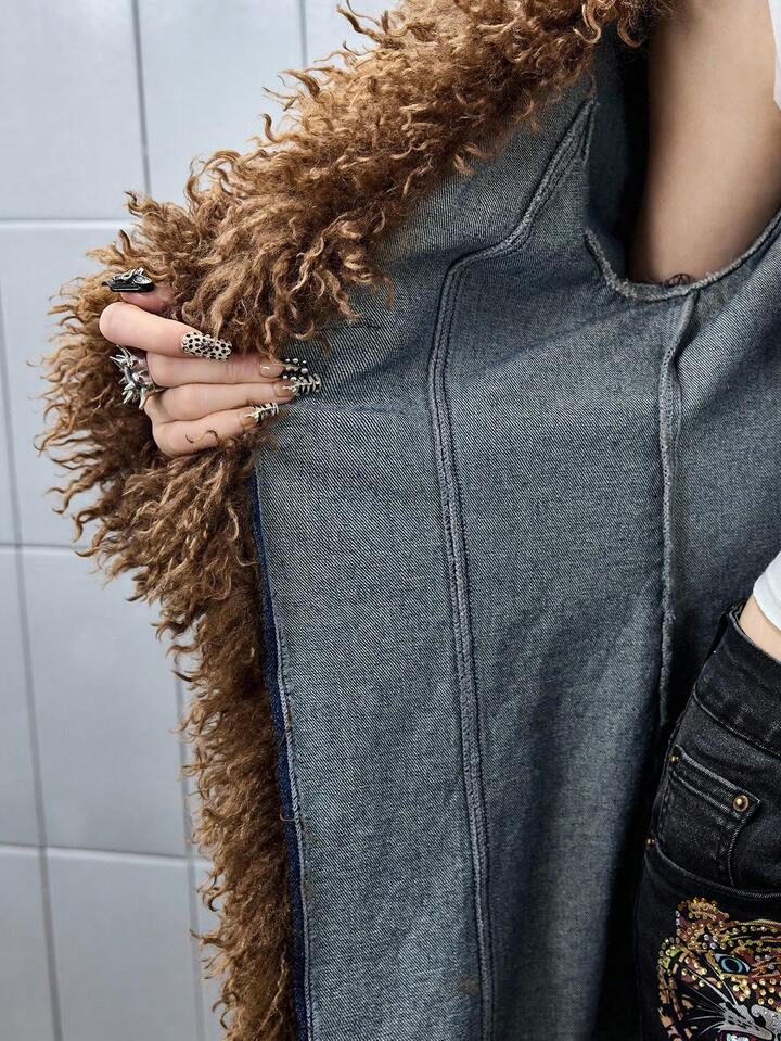 Hippie Veste en jean à manches longues avec col en fausse fourrure style Kpop Y2K pour femmes, pour l'automne/hiver