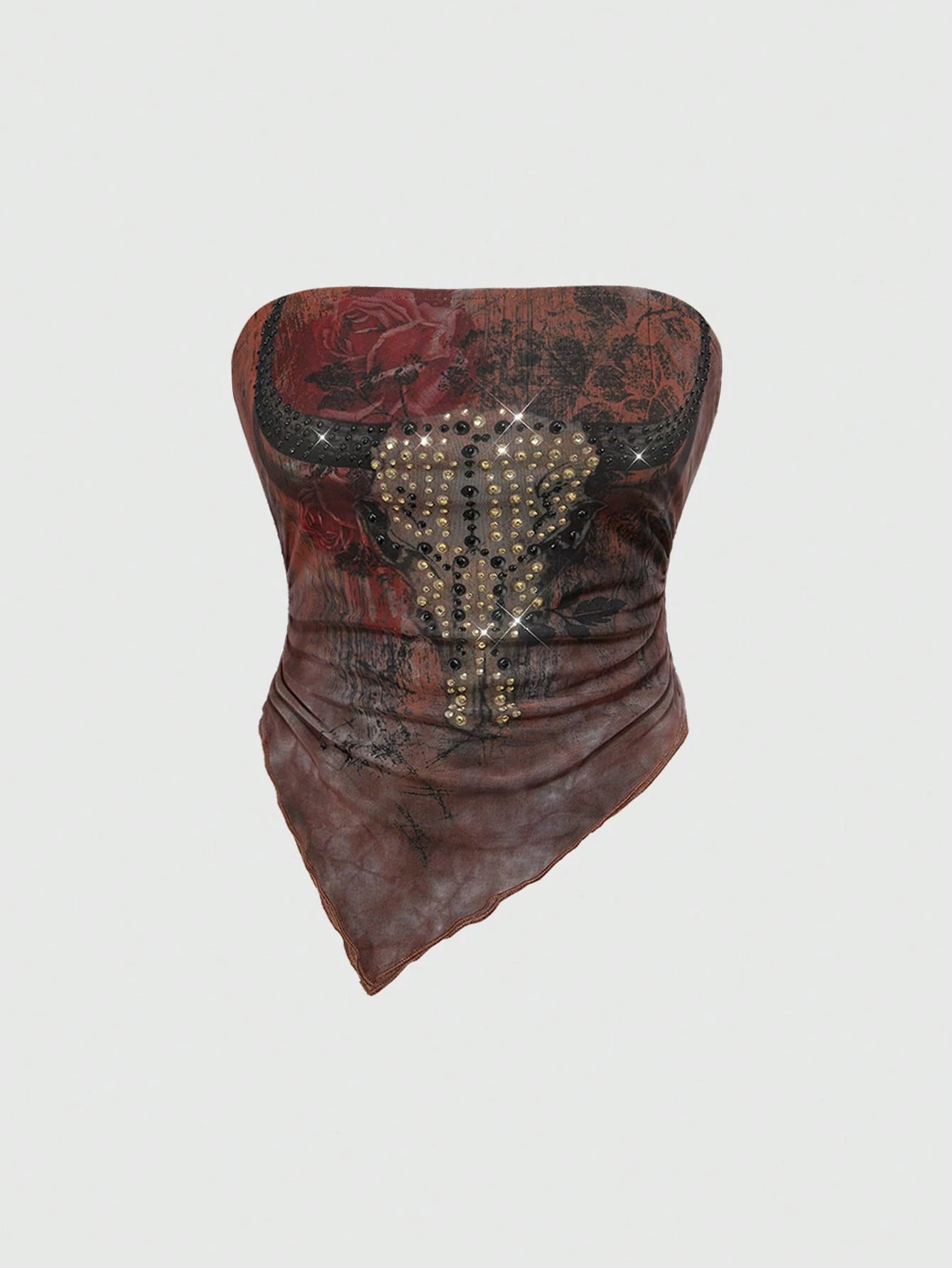 Hippie Top bandeau asymétrique à motif de taureau avec cristaux, style western rétro pour festivals de musique