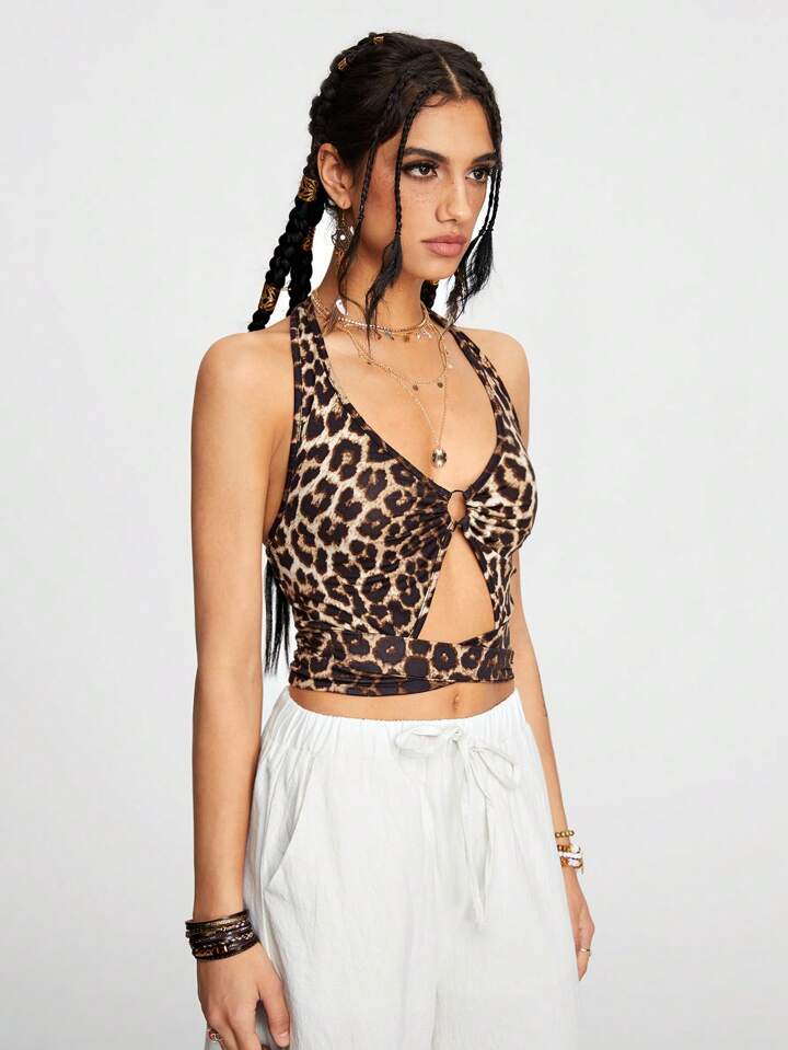 Hippie Haut d'été pour femmes en léopard bohémien, évidé avec lien à l'arrière, style ras-du-cou