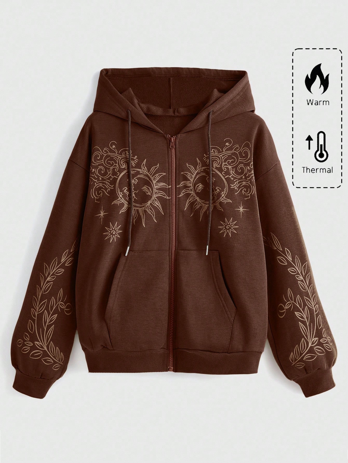 Hippie Sweat-shirt à capuche à manches longues, zip avant, poche et cordon de serrage, imprimé soleil pour femmes