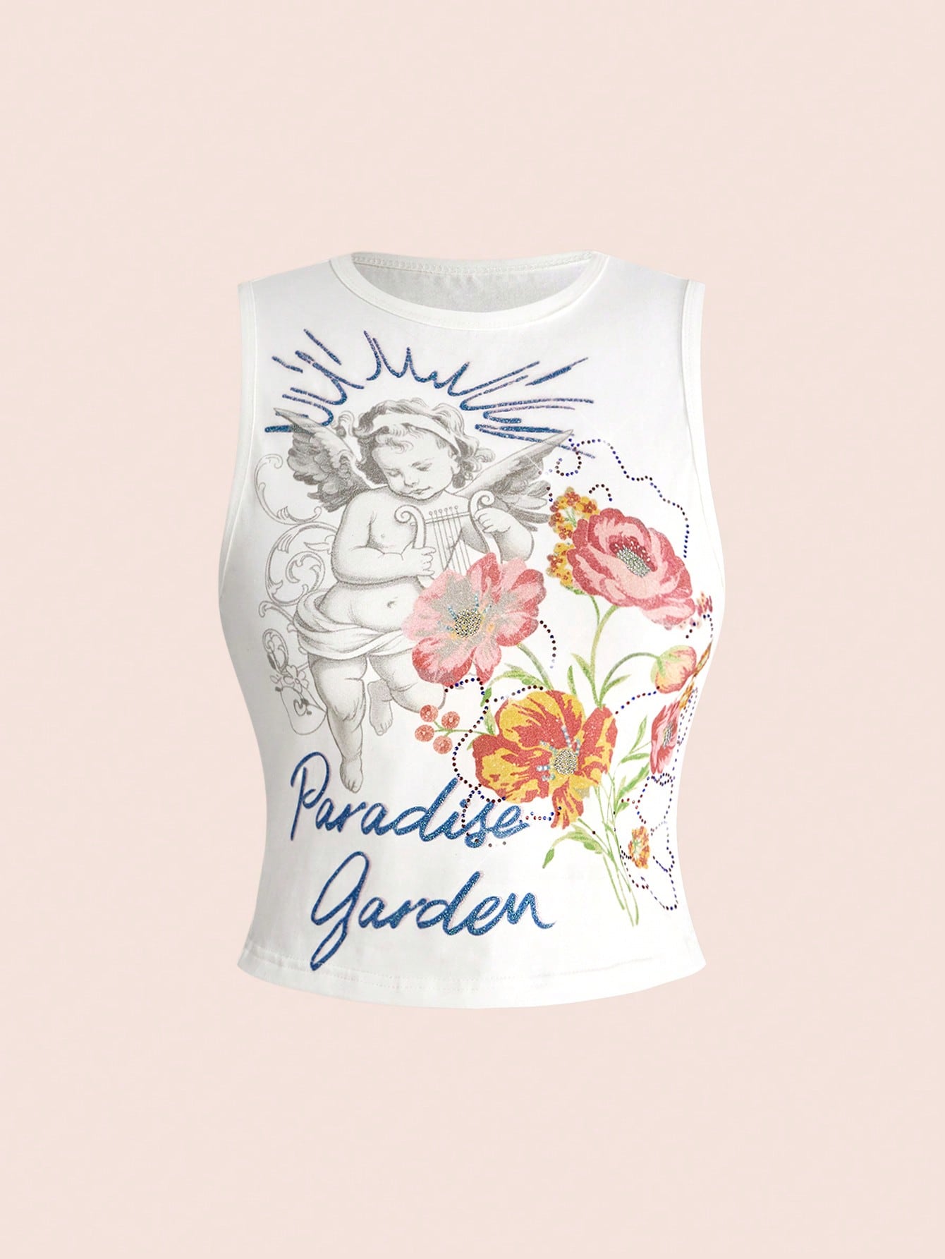 T-shirt ajusté pour femmes avec imprimé floral d'ange et ornements de strass
