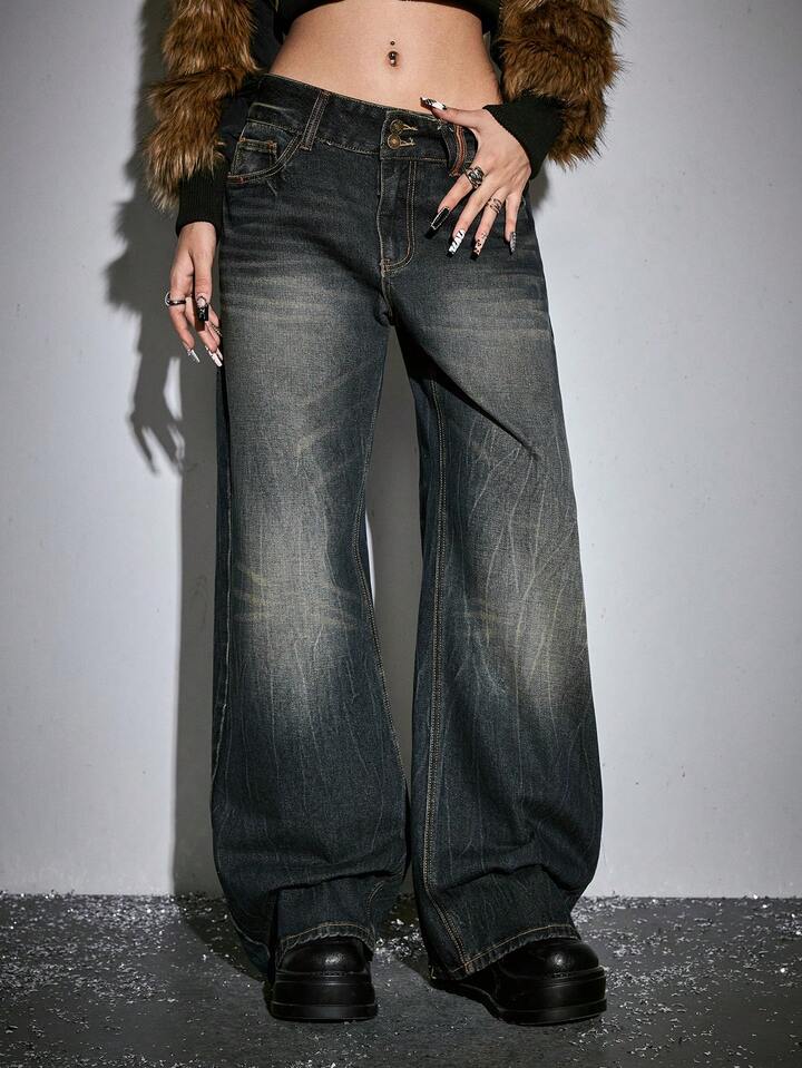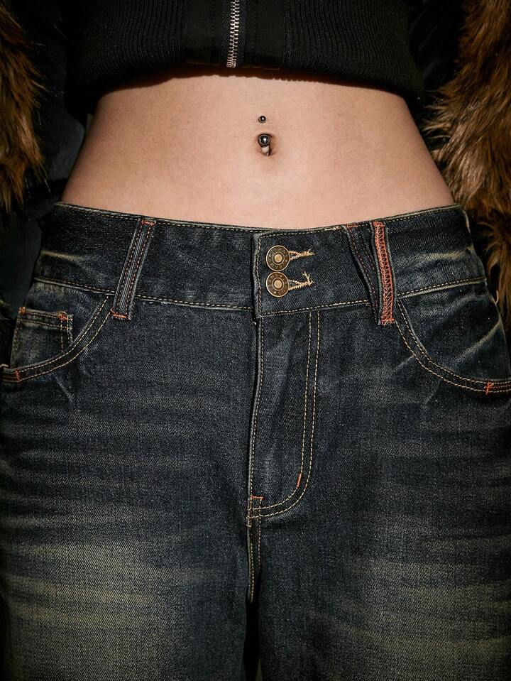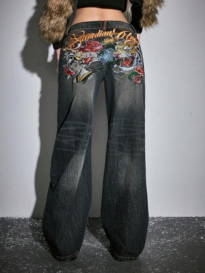 J-Fashion Nouveau jeans femme style chinois d'automne/hiver avec tête de tigre, figure de geisha et broderie anglaise, taille très basse, style rétro