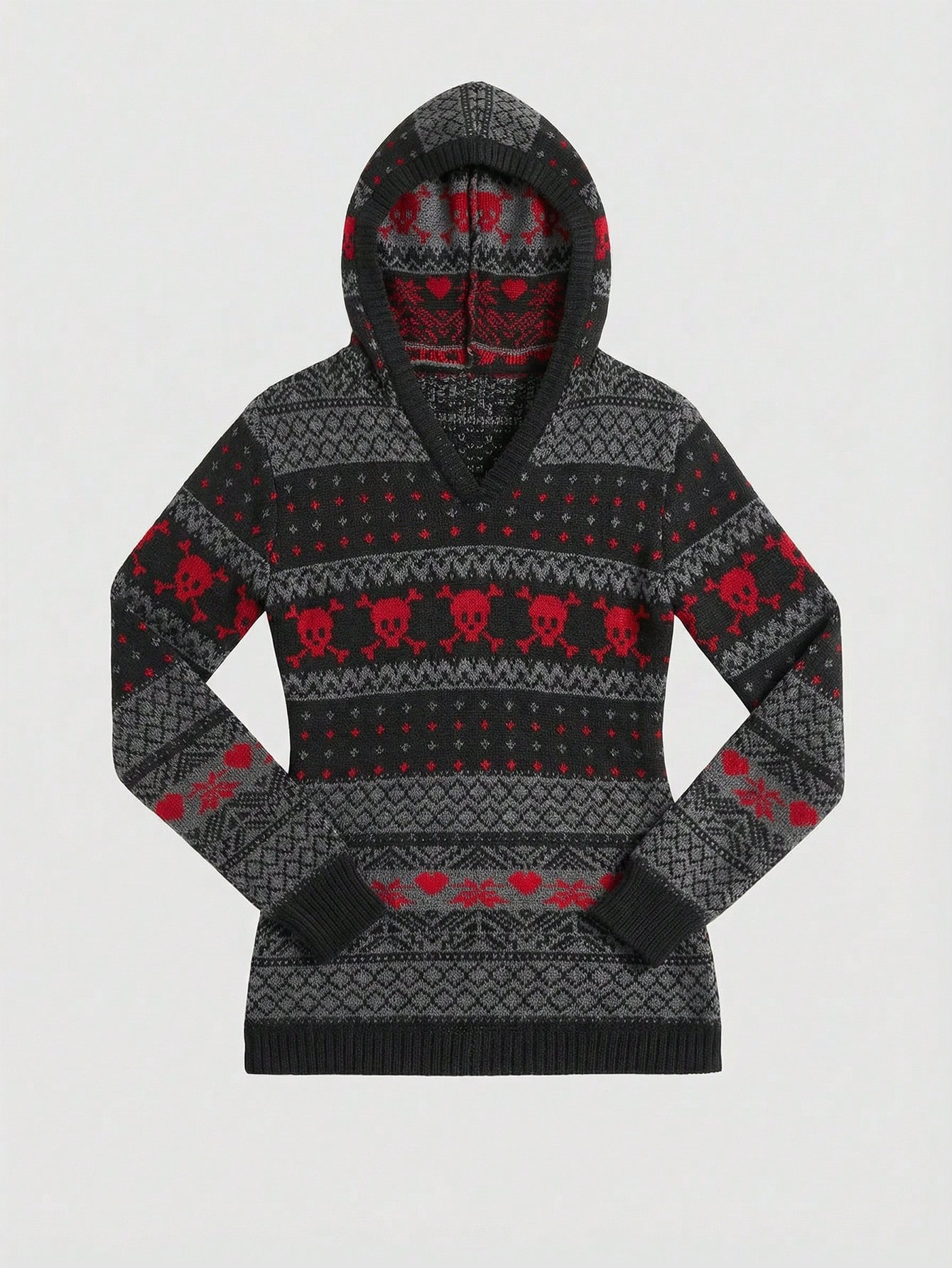 J-Fashion sweat-shirt à capuche en jacquard imprimé crâne d'Halloween pour femmes, automne/hiver