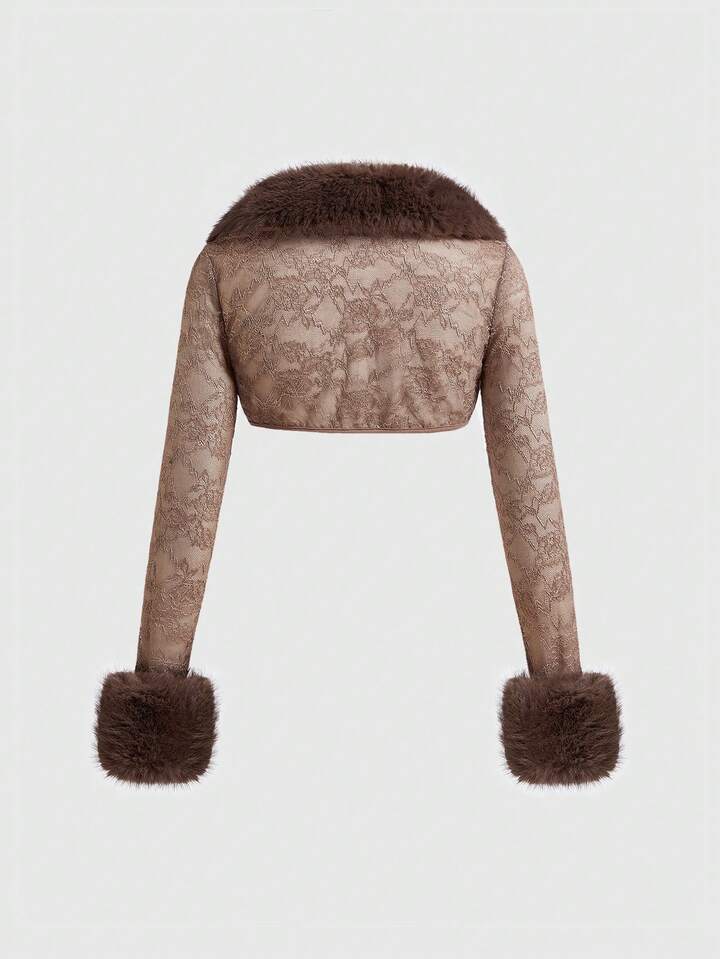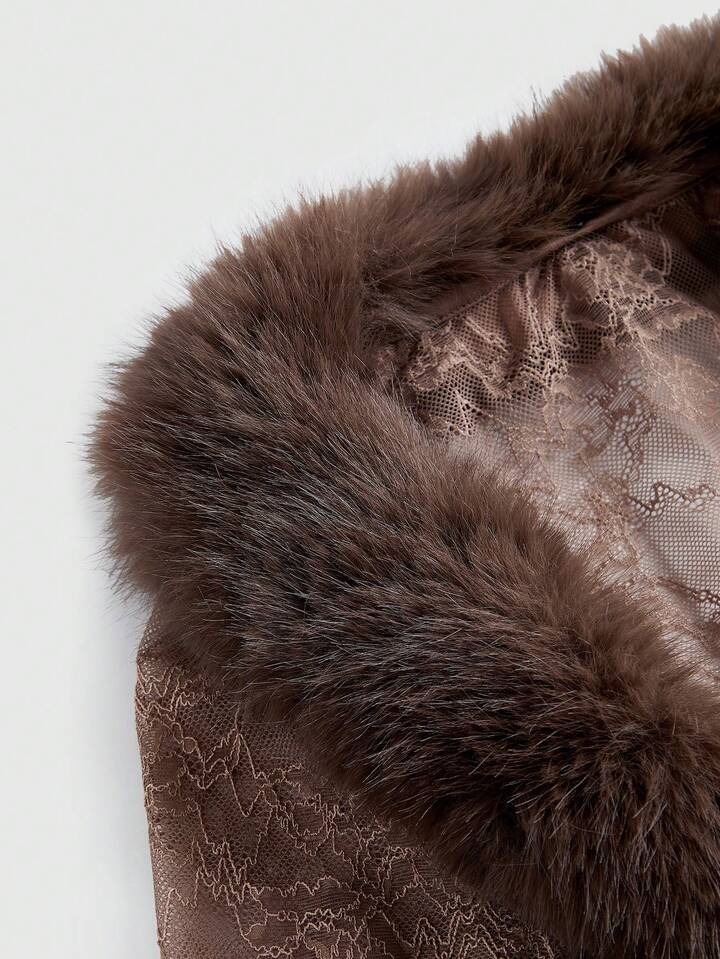 J-Fashion Top court à col en fourrure noire avec bordure en dentelle, style sexy Y2K pour festival de musique. Peut être porté avec un débardeur ou une robe.