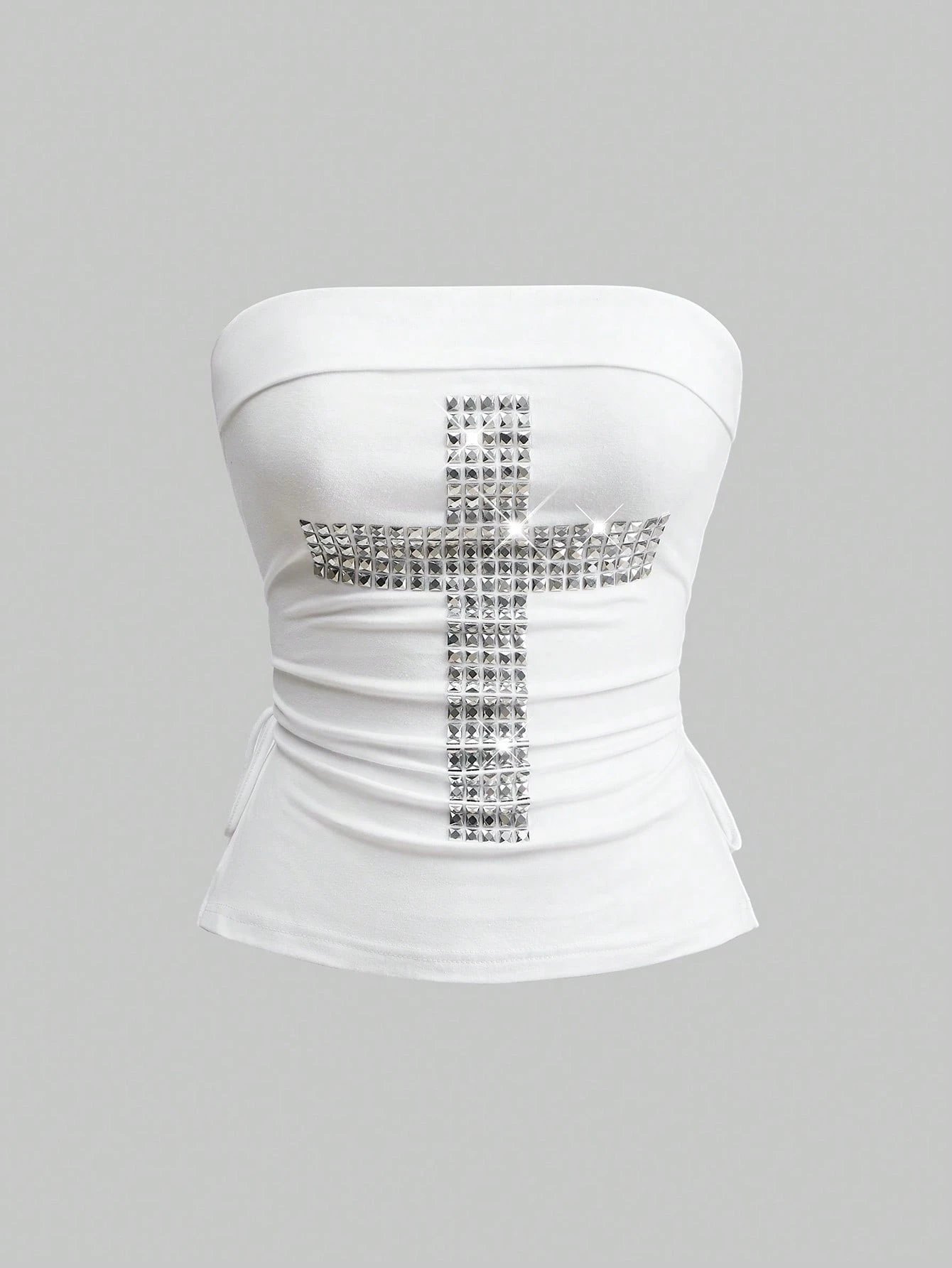J-Fashion Top court noir pour femmes avec décorations de strass en forme de croix, sans bretelles, avec cordon de serrage et fente à l'ourlet