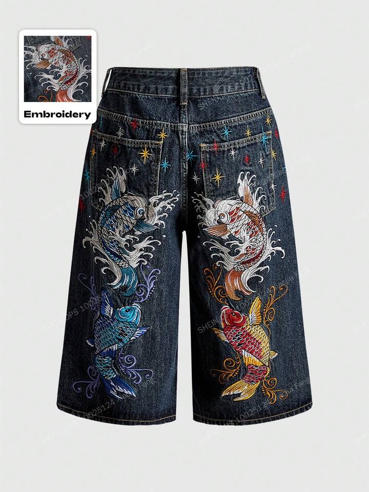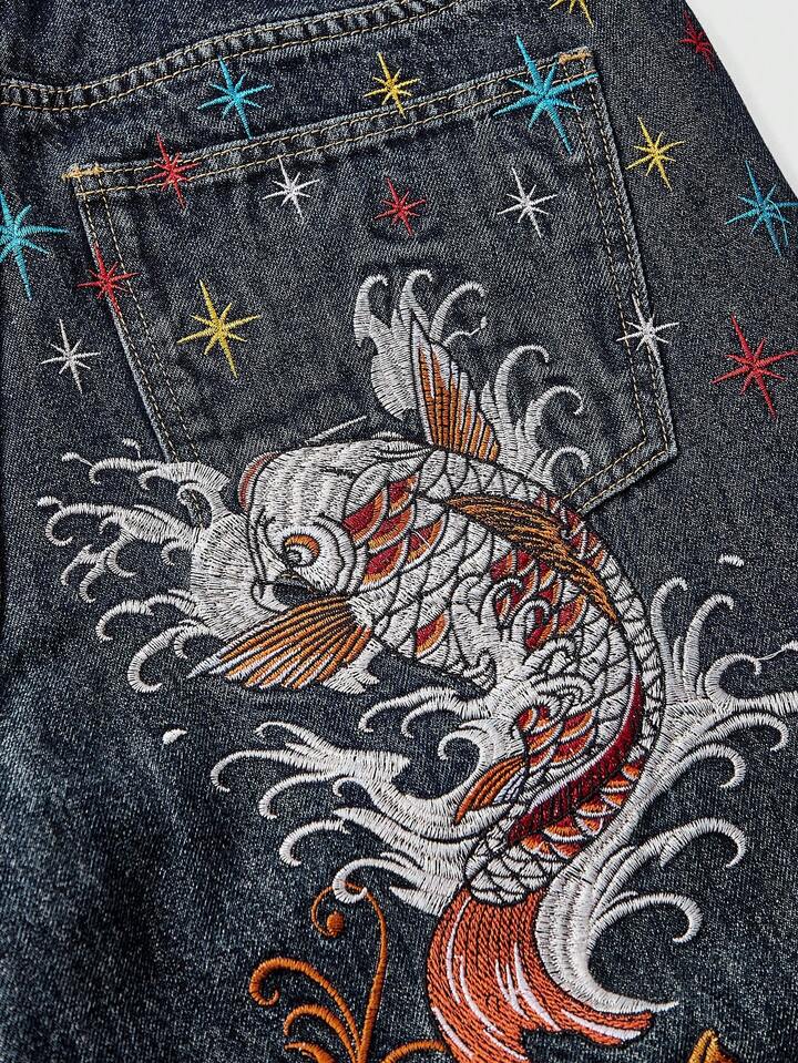 J-Fashion Jeans amples et évasés unisexes à broderie florale de carpe, style rétro hip-hop