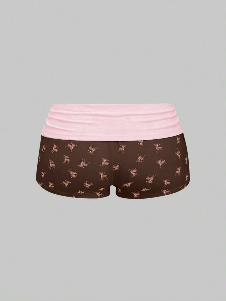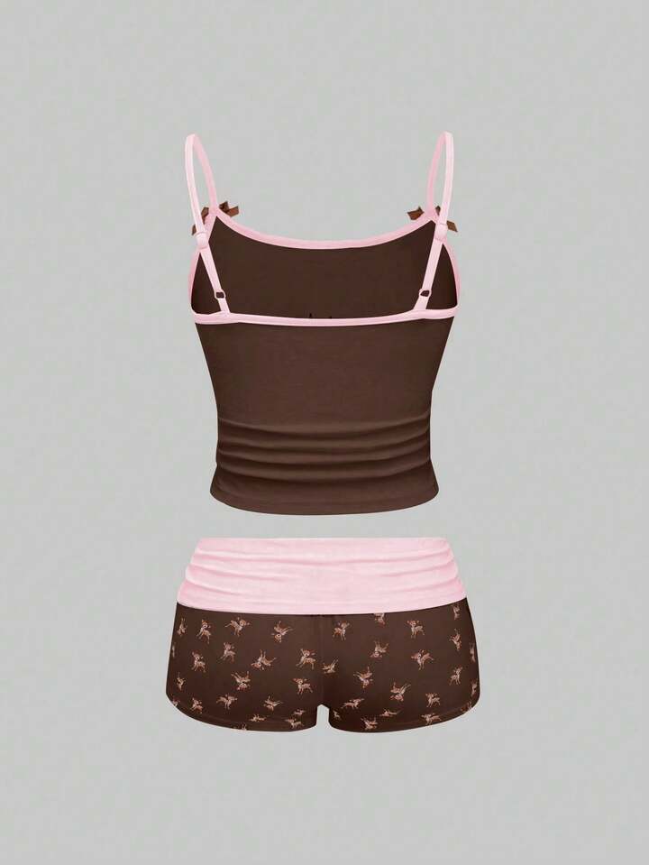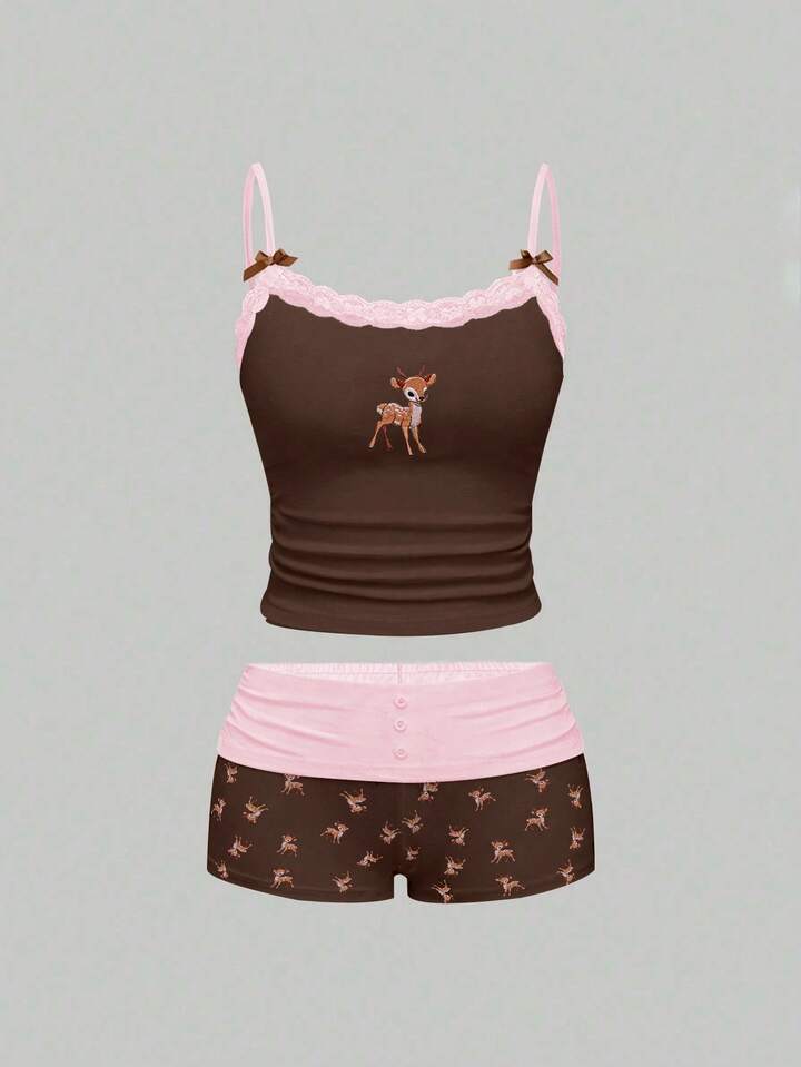 J-Fashion Ensemble Top camisole en dentelle avec broderie de cerf mignon et short imprimé cerf pour femmes