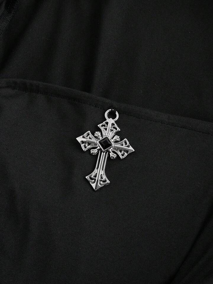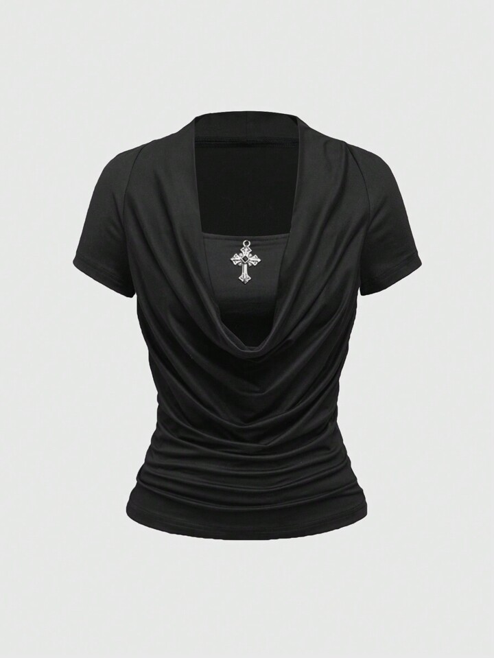 J-Fashion Femmes T-shirt à manches courtes élastique de couleur unie avec pendentif croisé de style vintage