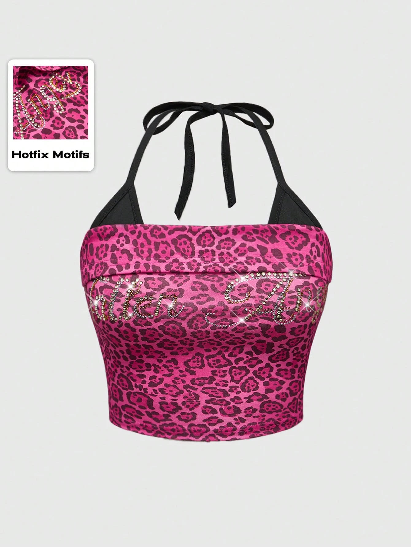 J-Fashion Débardeur hauts rose léopard sexy avec slogan et décoration de strass pour femmes
