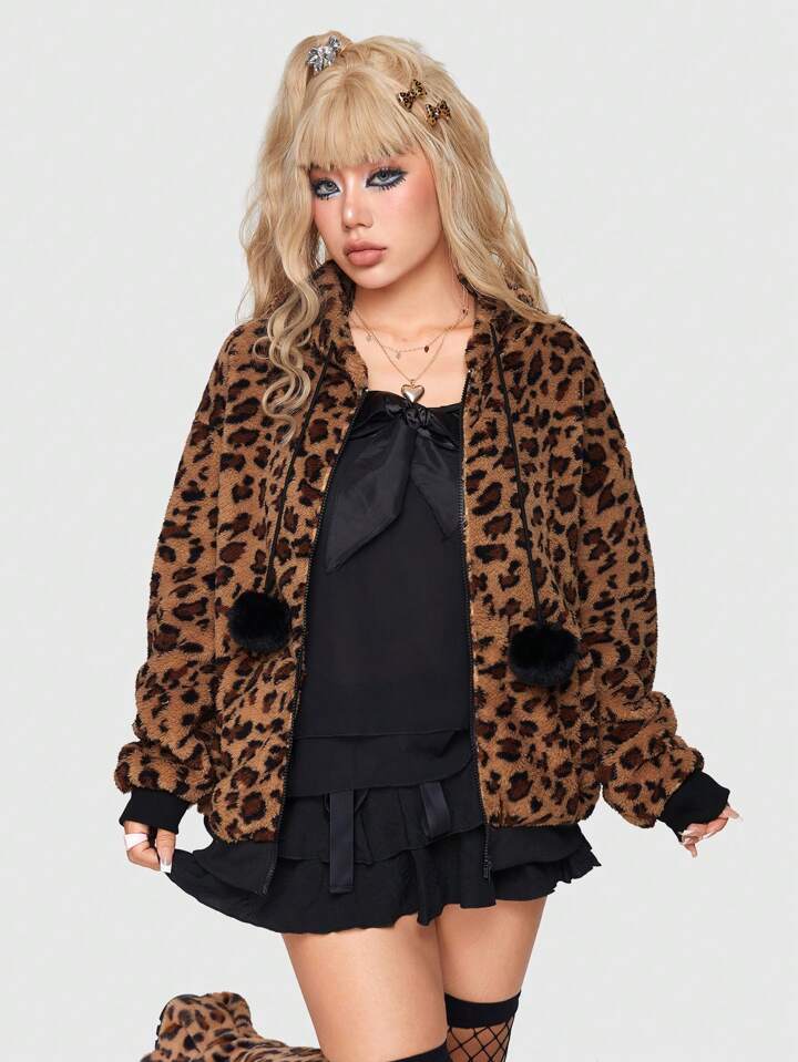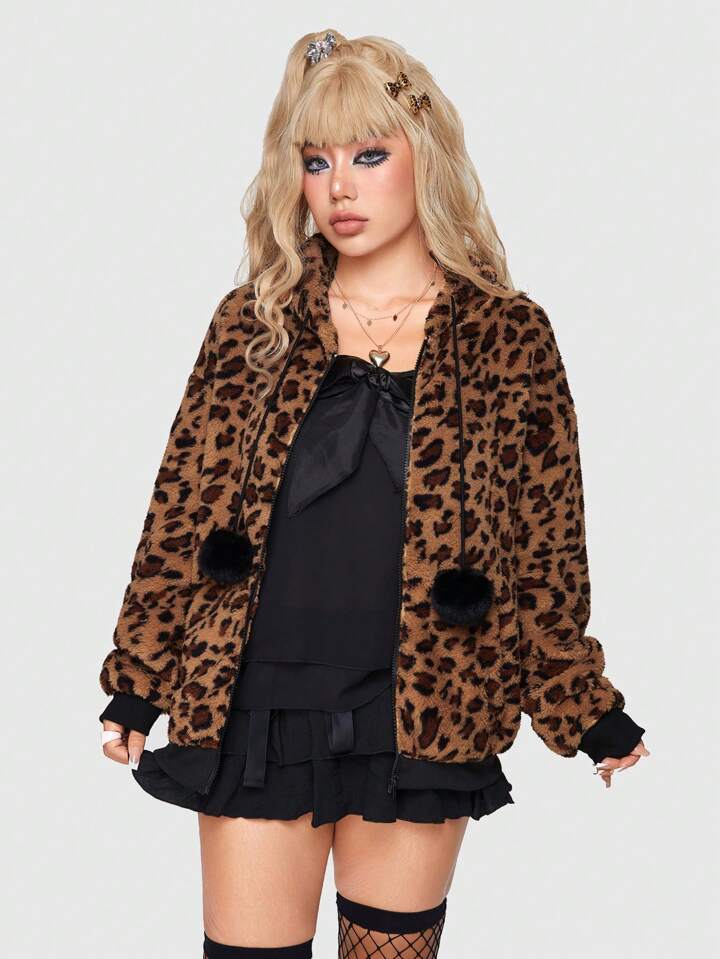 J-Fashion Veste à capuche à cordon de serrage en polaire imprimé léopard avec pompons pour femmes