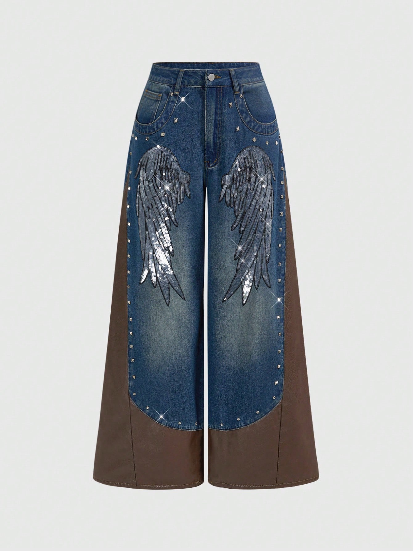 J-Fashion Pantalon large en jean femme style rétro punk, style de rue, festival de musique, patchwork en PU, ailes pailletées, broderie