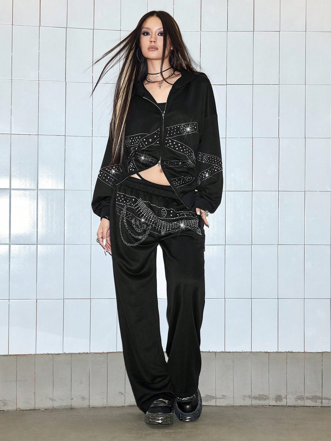 J-Fashion Sweat-shirt-shirt oversize pour femmes avec ceinture à rivets, imprimé style punk décontracté Y2K