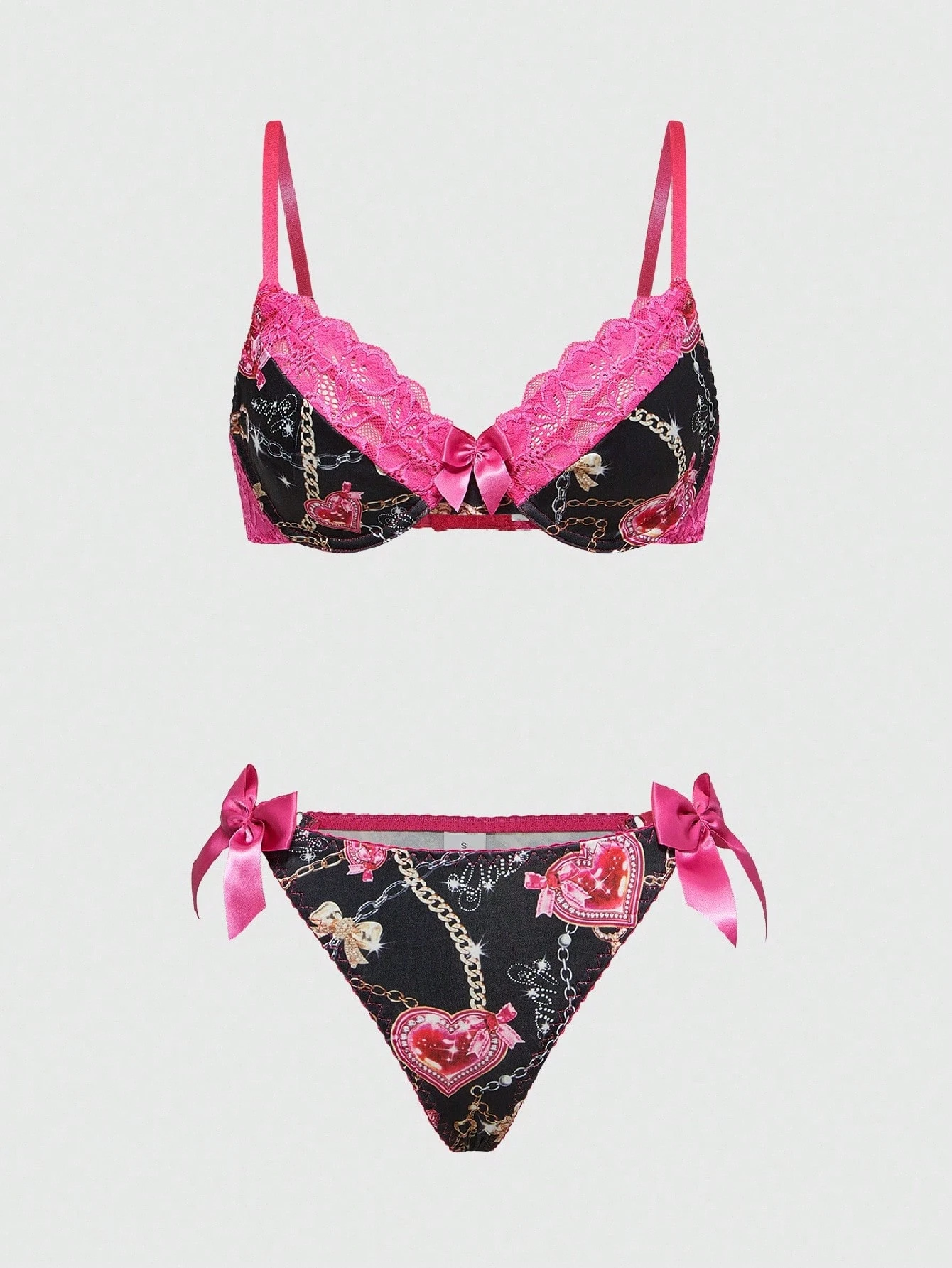 J-Fashion Ensemble de soutien-gorge à armatures pour femmes avec imprimé chaîne en forme de cœur, couleurs contrastées, patchwork de dentelle et décoration de nœud dans le style Harajuku Y2K
