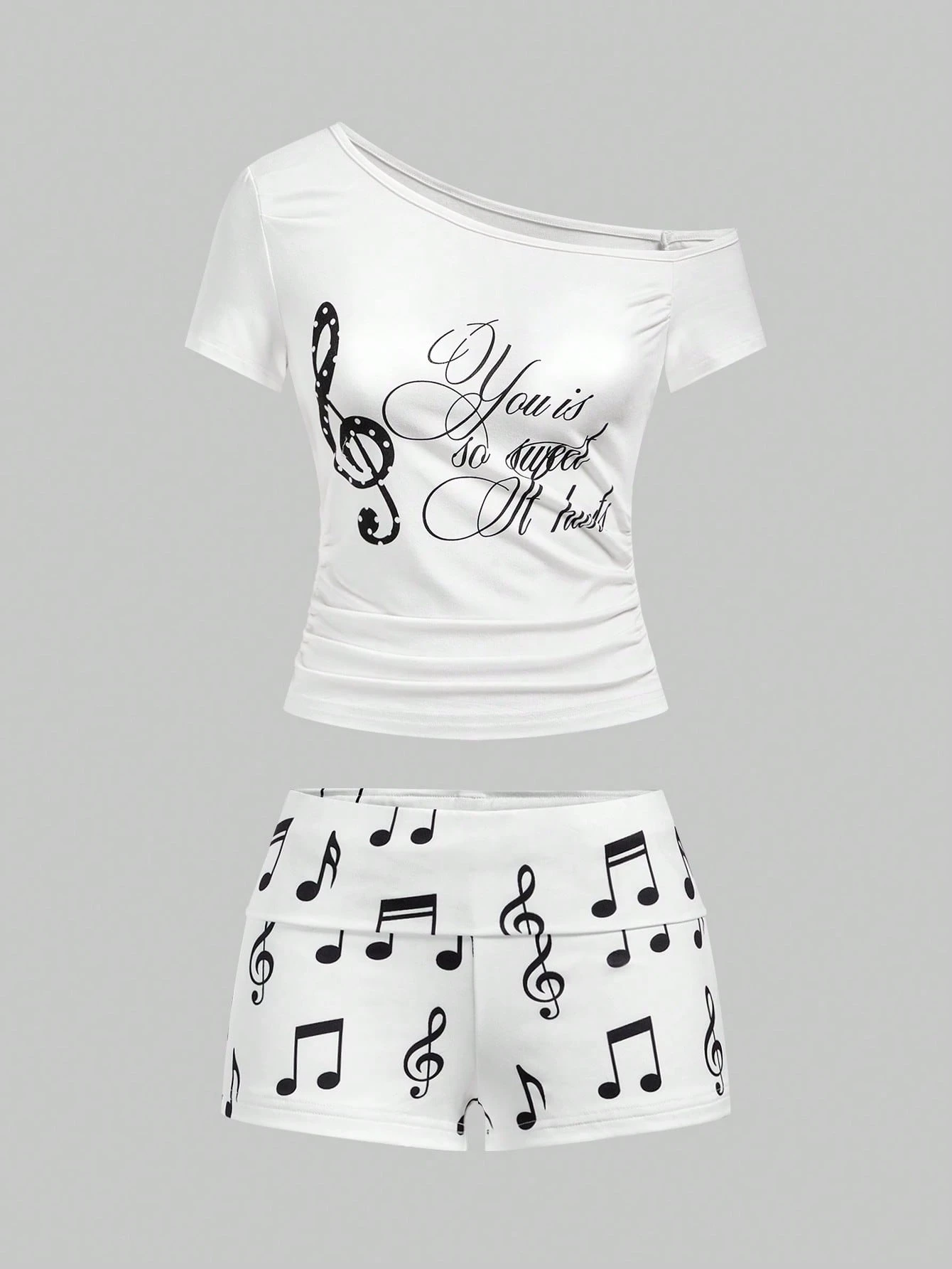 J-Fashion Ensemble 2 pièces femme avec Top à bretelles sexy imprimé notes de musique et shorts super courts taille basse