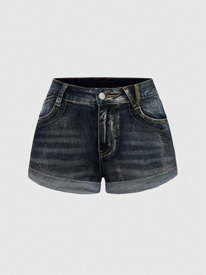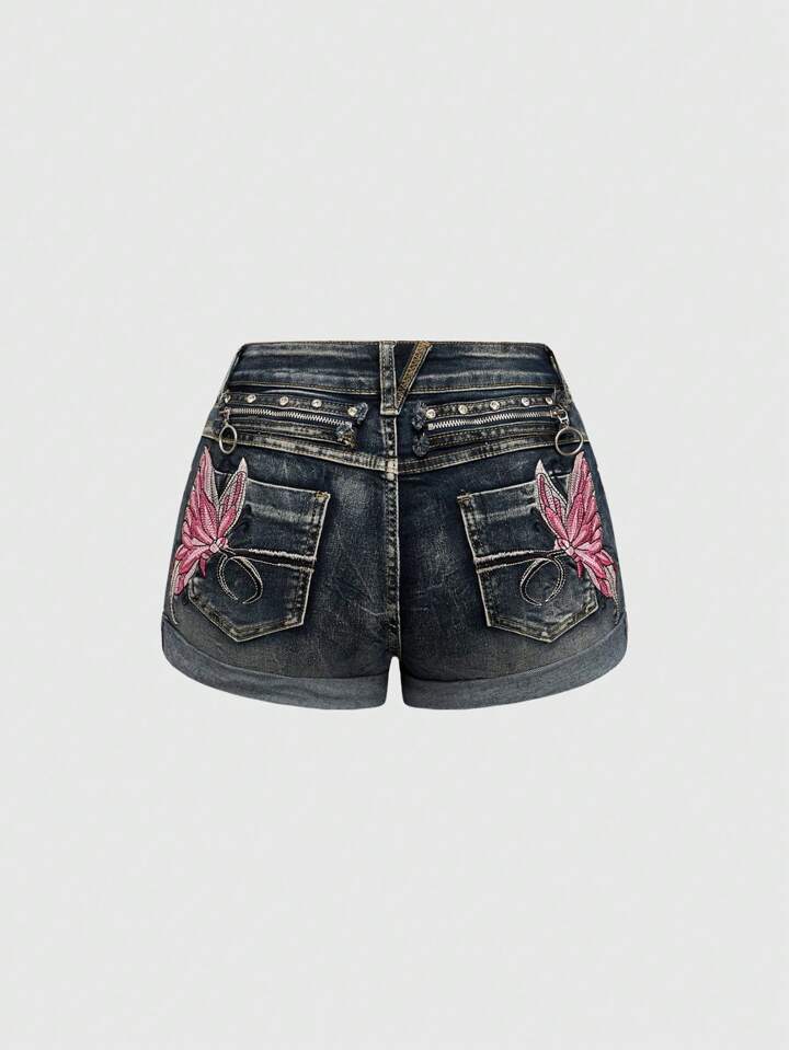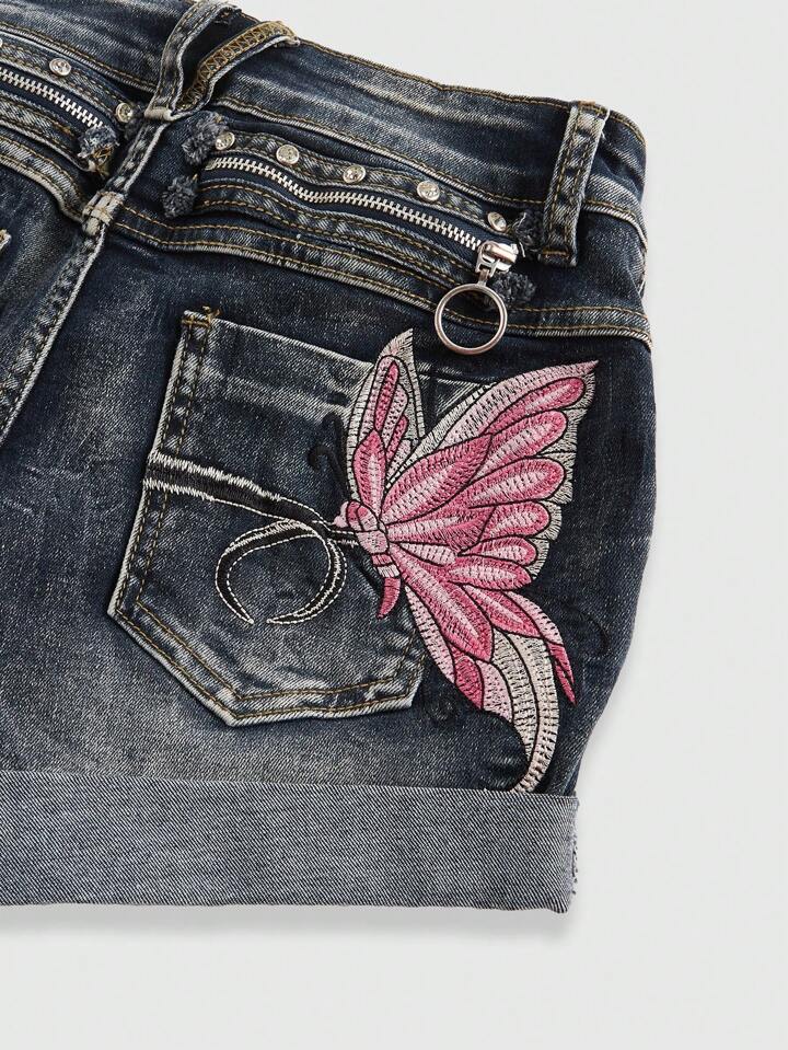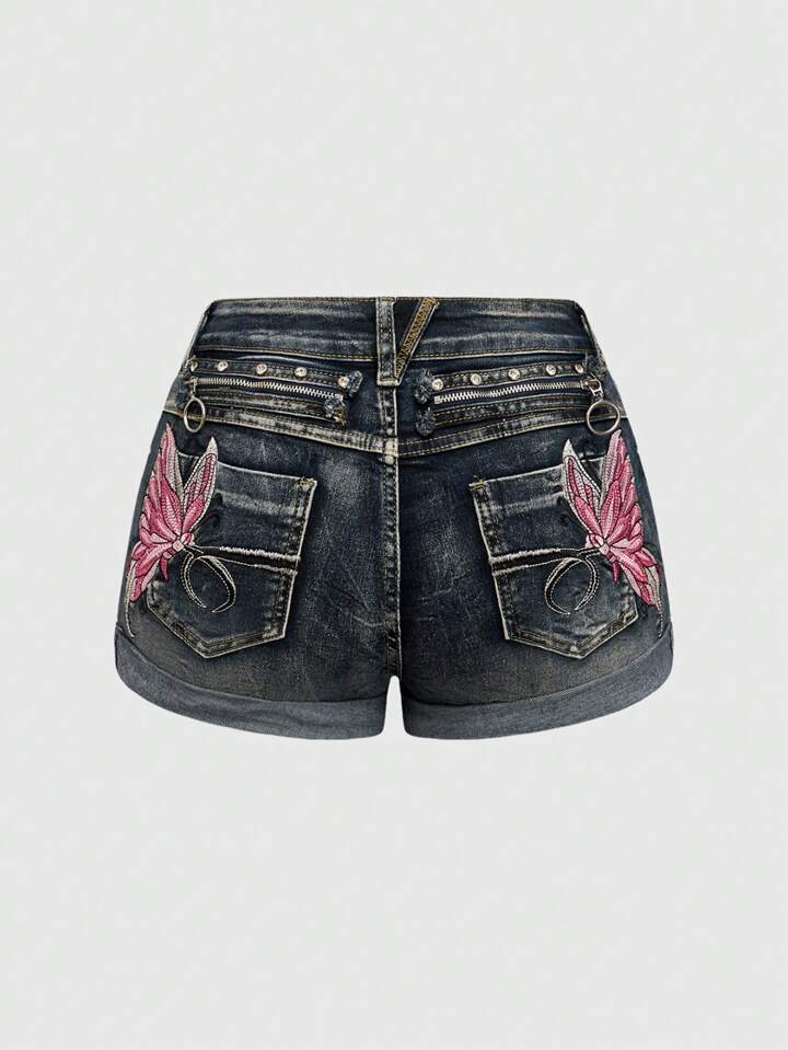 J-Fashion Short en jean taille basse sexy avec effet usé, style Y2K, avec broderie papillon