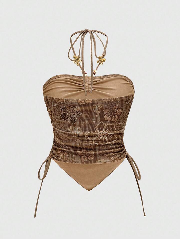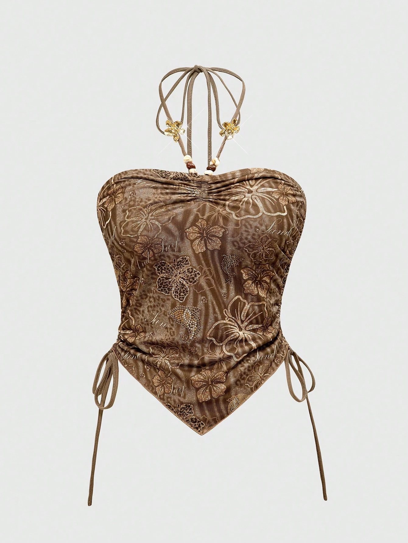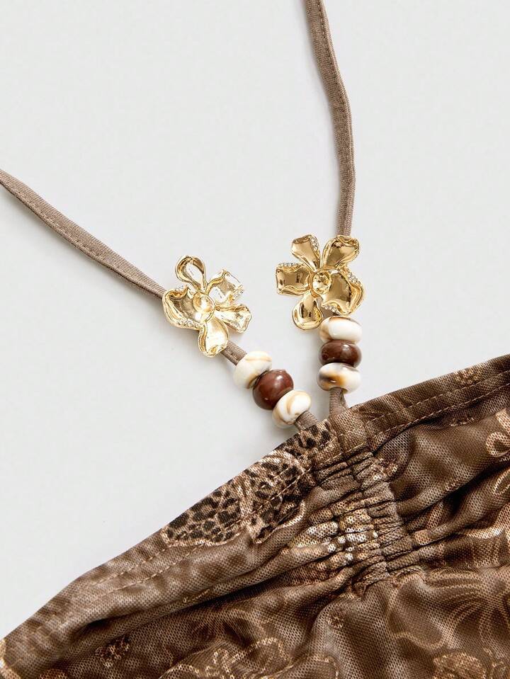 J-Fashion Top à col ras-du-cou en maille perlée avec imprimé léopard, dauphins et hibiscus, style vacances Y2K