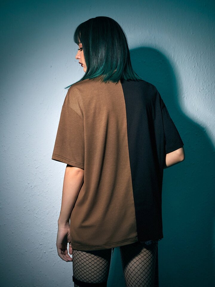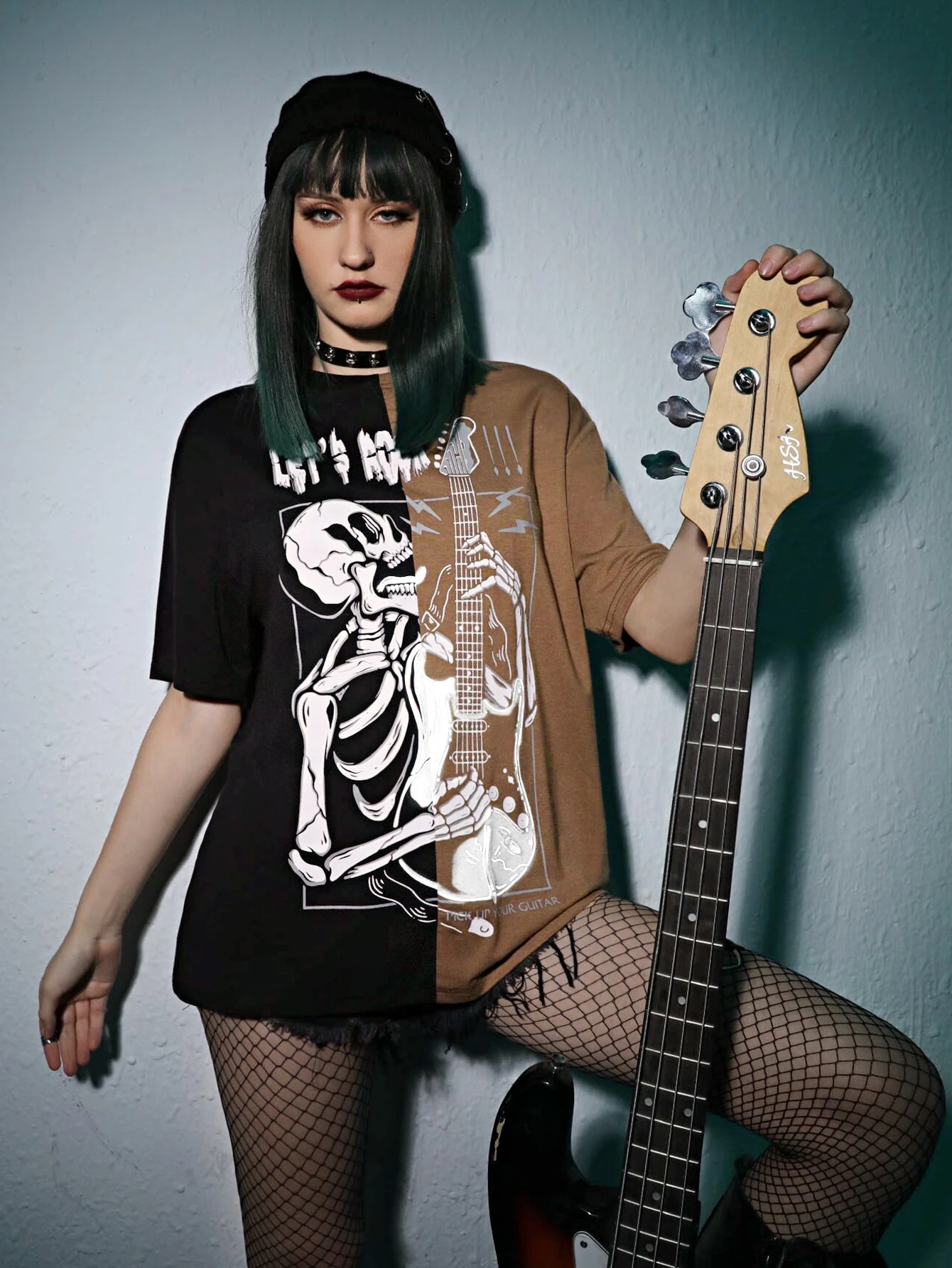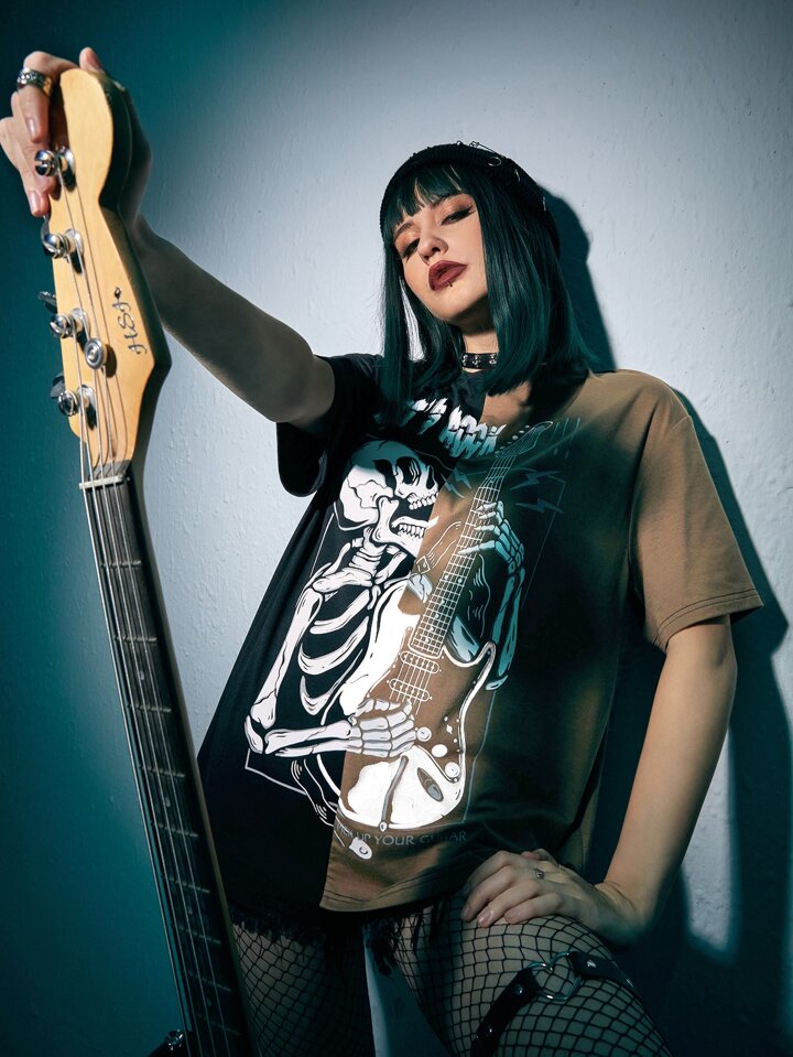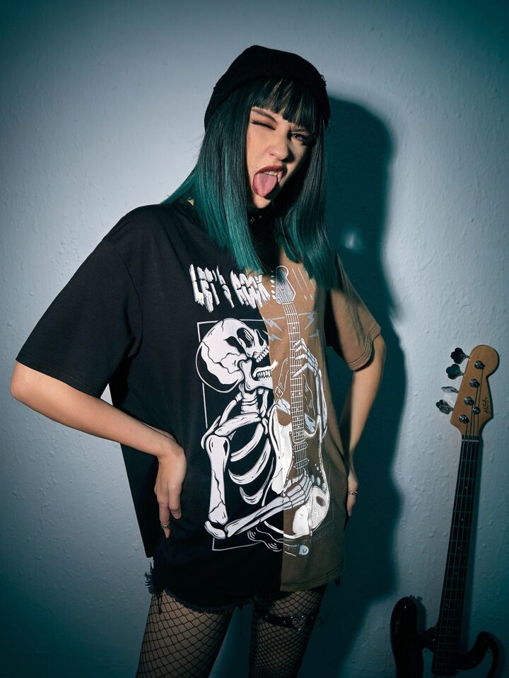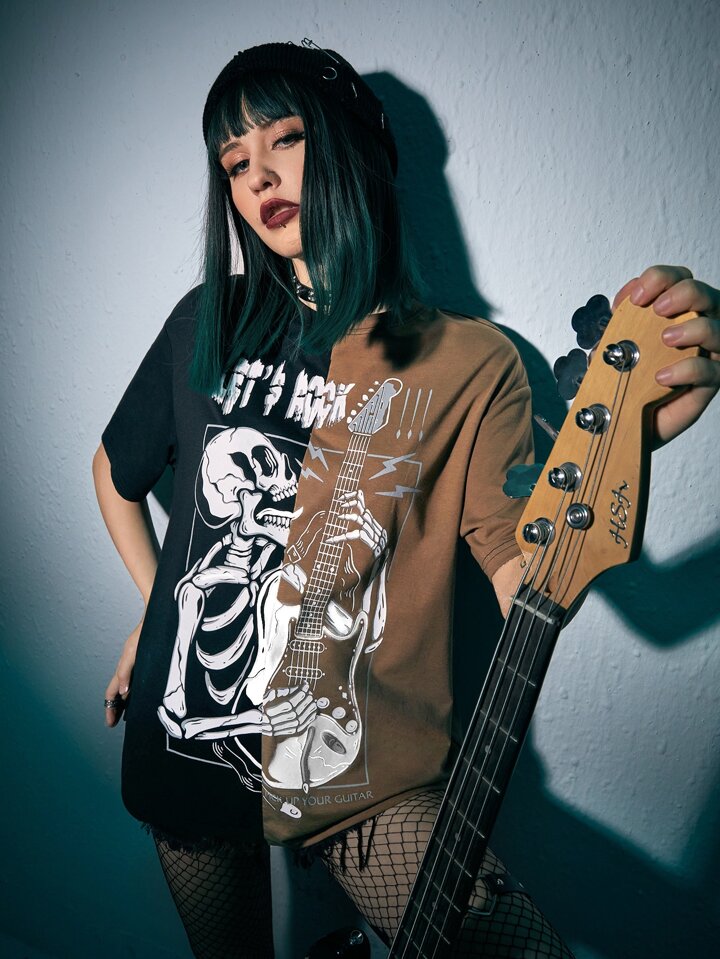JRart T-shirt punk rock slogan à motif tête de mort et guitare à blocs de couleurs