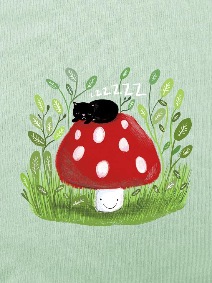Joanne Wong Art Kawaii T-shirt graphique champignon et chat, école