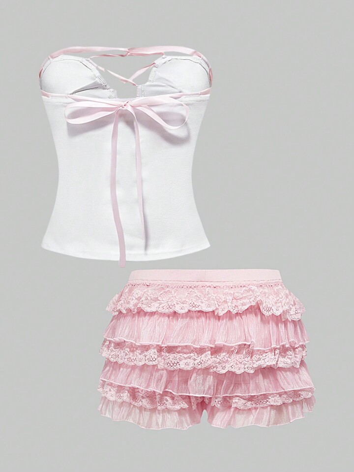 Kawaii 2 pièces/Set Top tube sexy à nœud et Jupe à nœud en ruban de dentelle pour femme, Cadeau sensuel pour la Saint-Valentin