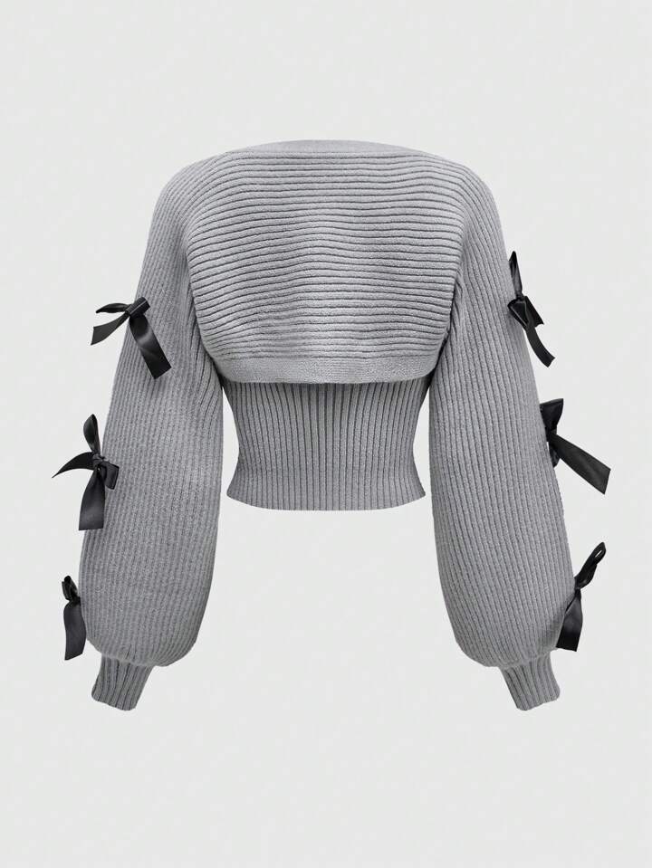 Kawaii 2 pièces Cardigan à manches lanternes et débardeur avec décoration nœud papillon mignon "himekaji" pour femmes, ensemble de tenue casual en superposition