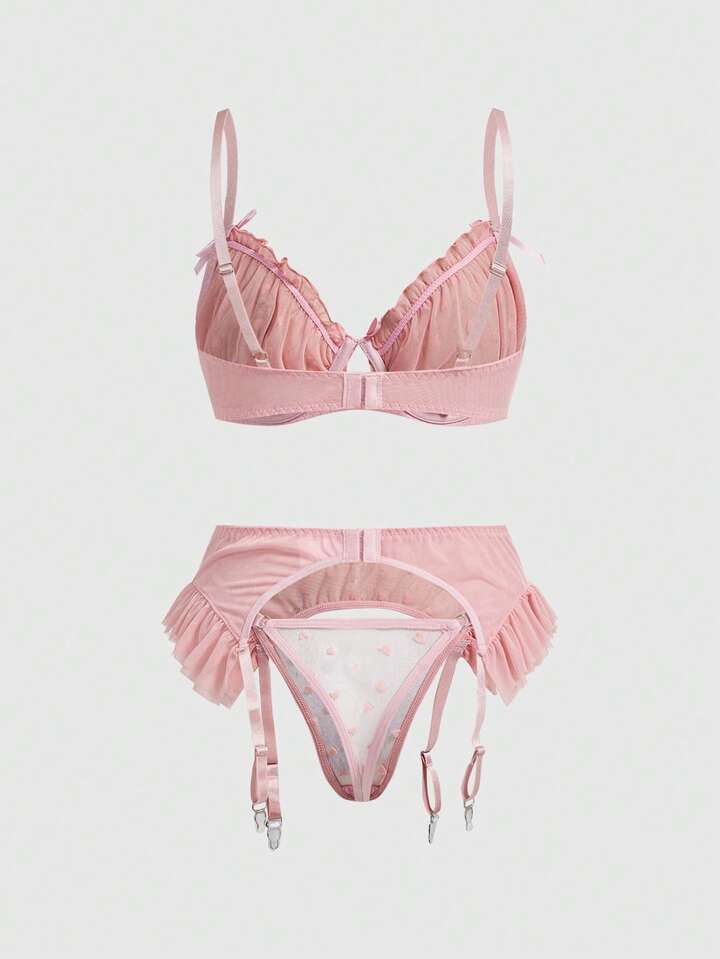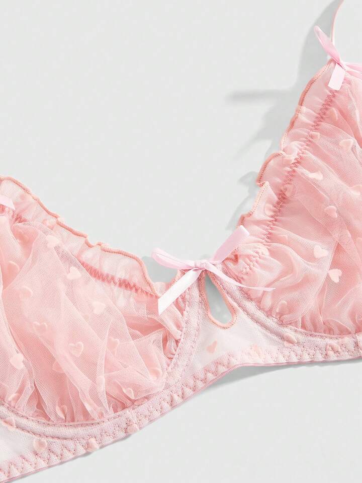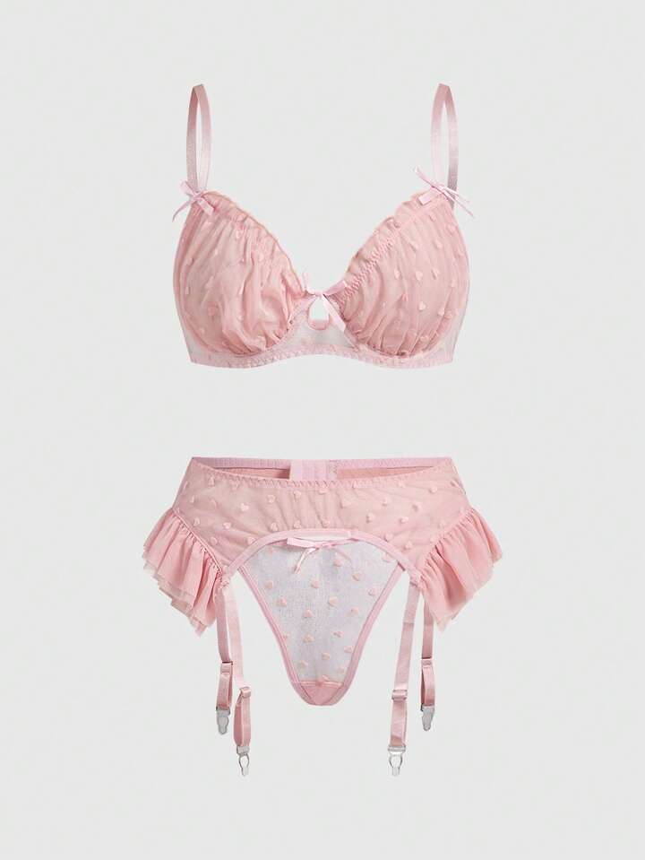 Kawaii 3 pièces Ensemble de lingerie mignon et sexy comprenant un soutien-gorge à armatures en jacquard floqué, un string et une jarretelle