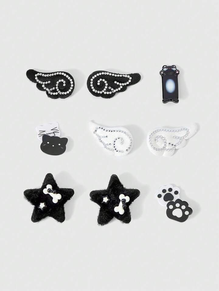 Kawaii 9 épingles à cheveux faites à la main avec ailes mignonnes, combinaison d'épingles à cheveux en peluche noire et blanche avec strass, ensemble d'accessoires pour cheveux Lolita multi-pièces.