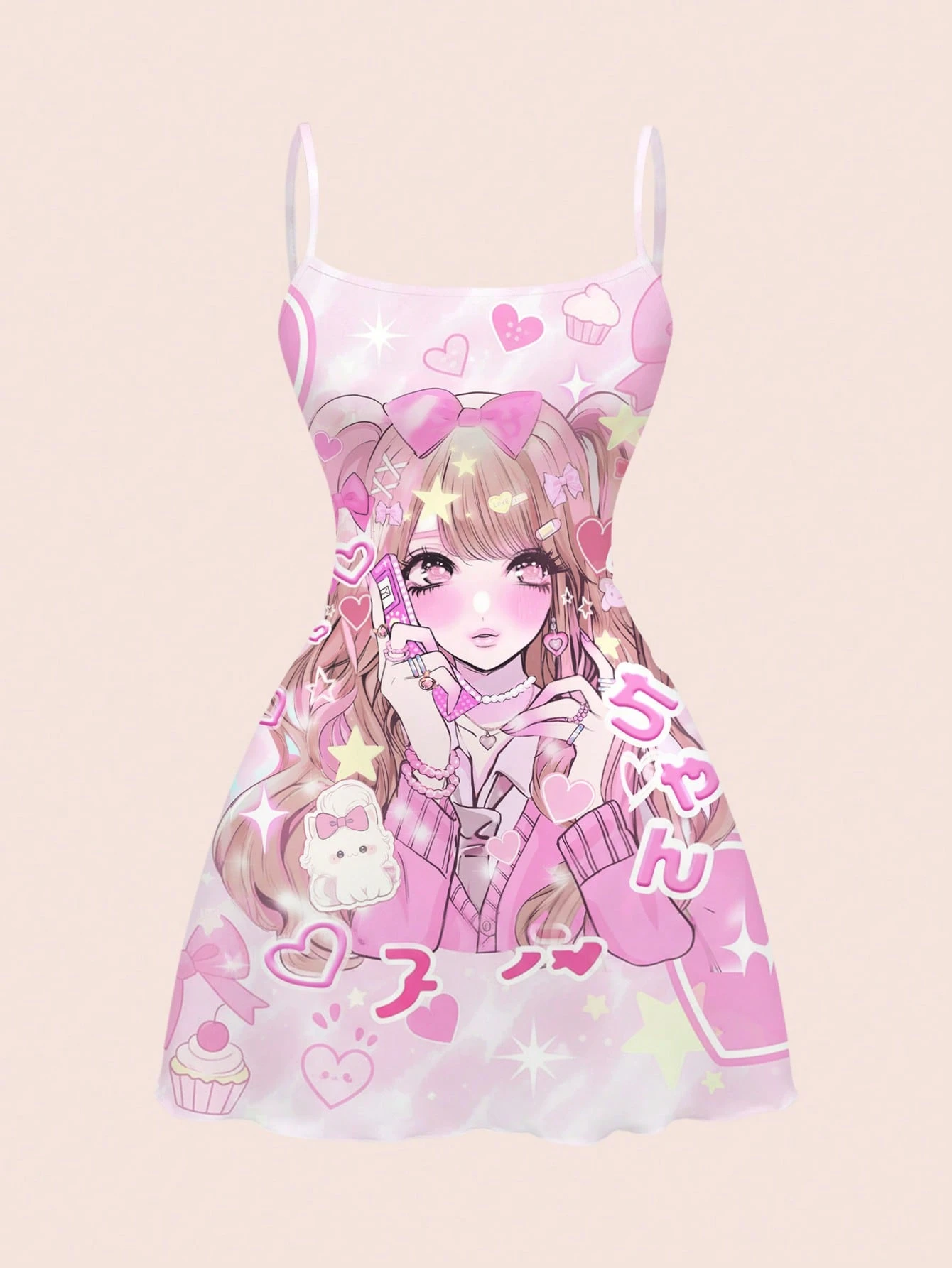 Robe mini imprimée intégralement avec un slogan de cœur féminin inspiré du style kawaii anime pour femmes