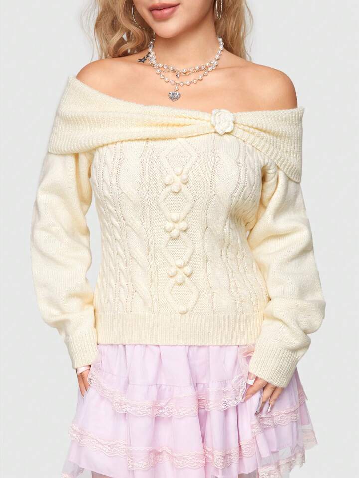 Kawaii Pull À Épaules Dénudées En Tricot Torsadé, Pull-over