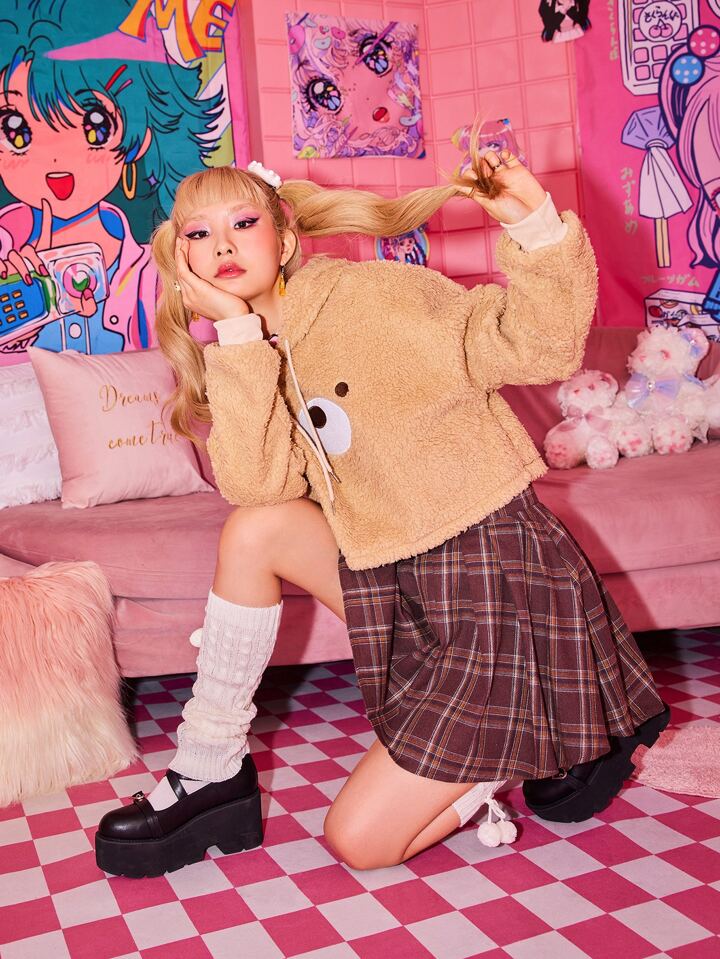 Kawaii Sweat-shirt à capuche à broderie à cordon court en tissu duveteux