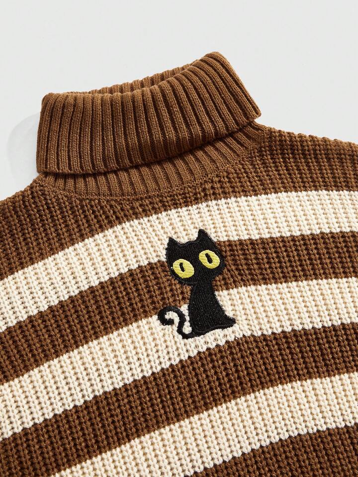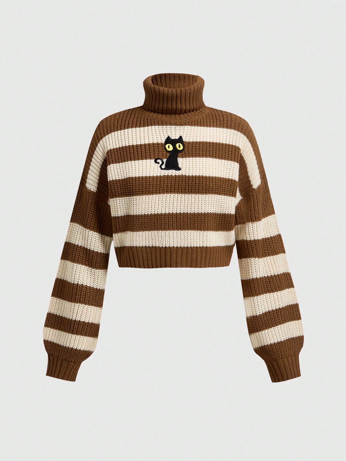 Kawaii Pull col roulé rayé avec broderie de chat noir mignon et décontracté pour filles