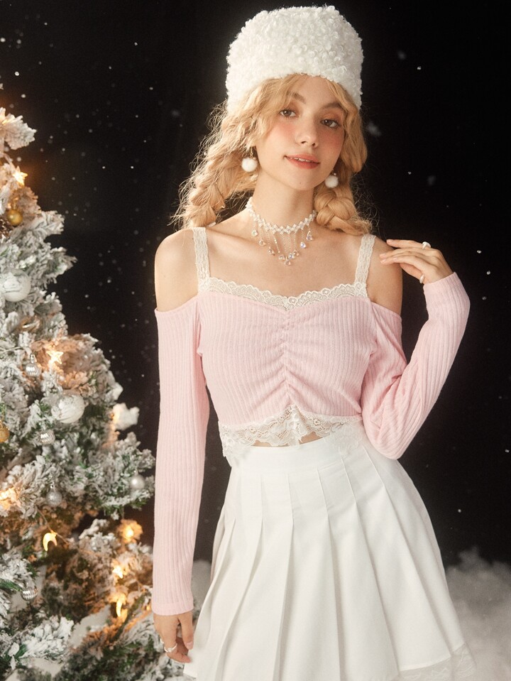 Kawaii T-shirt Noël en dentelle à épaules dénudées